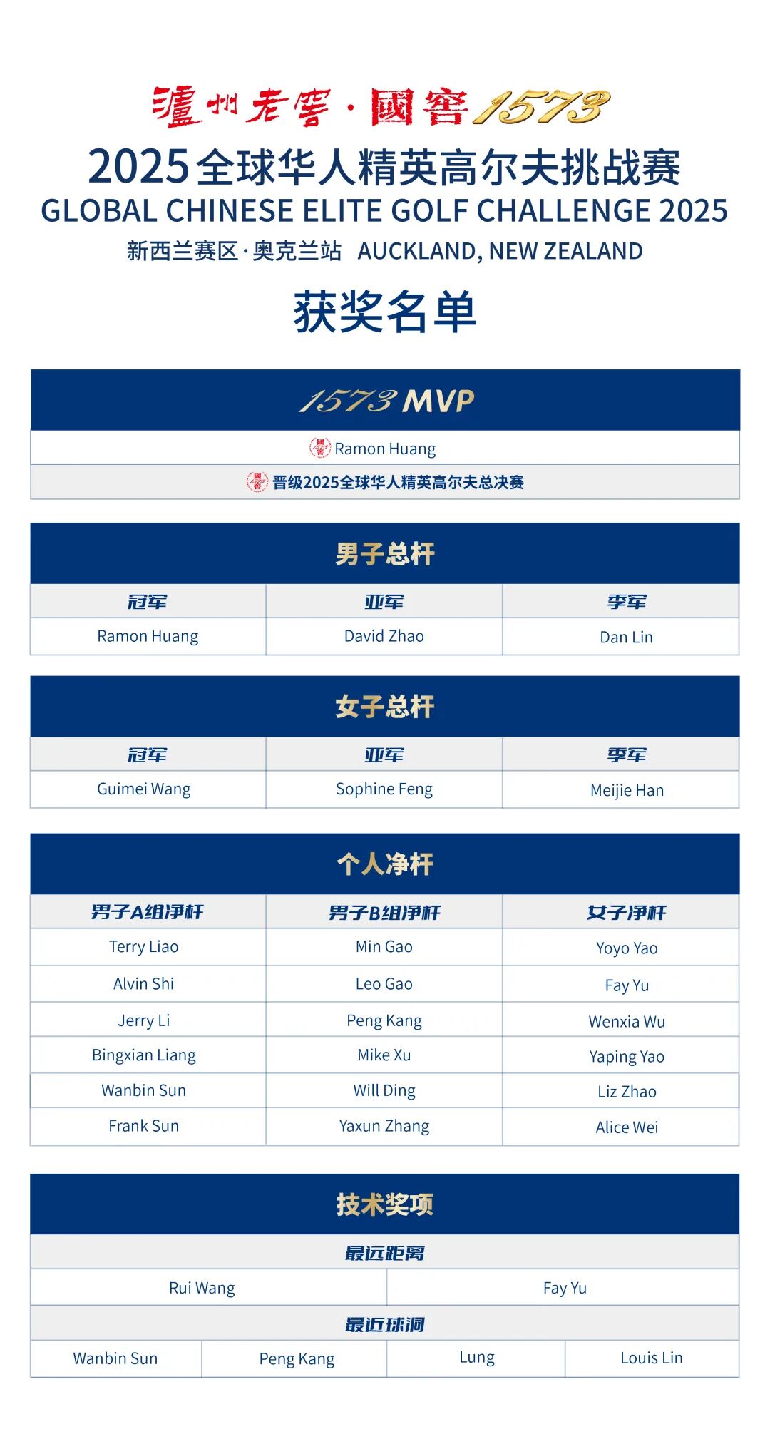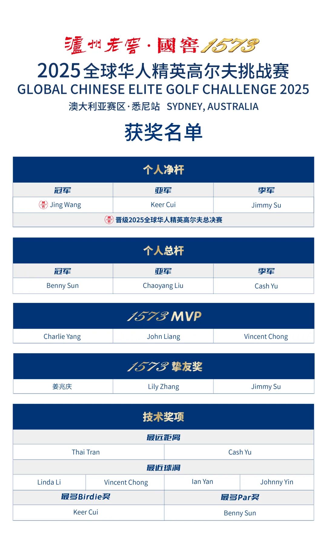 比赛过程精彩激烈,球员们拼尽全力。最终,Jing Wang脱颖而出,斩获净杆冠军,夺得2025华人总决赛晋级资格,总杆冠军被Benny Sun收入囊中。赛事同时决出1573 MVP、最远距离、最近球洞、最多鸟、最多par等多个奖项。
