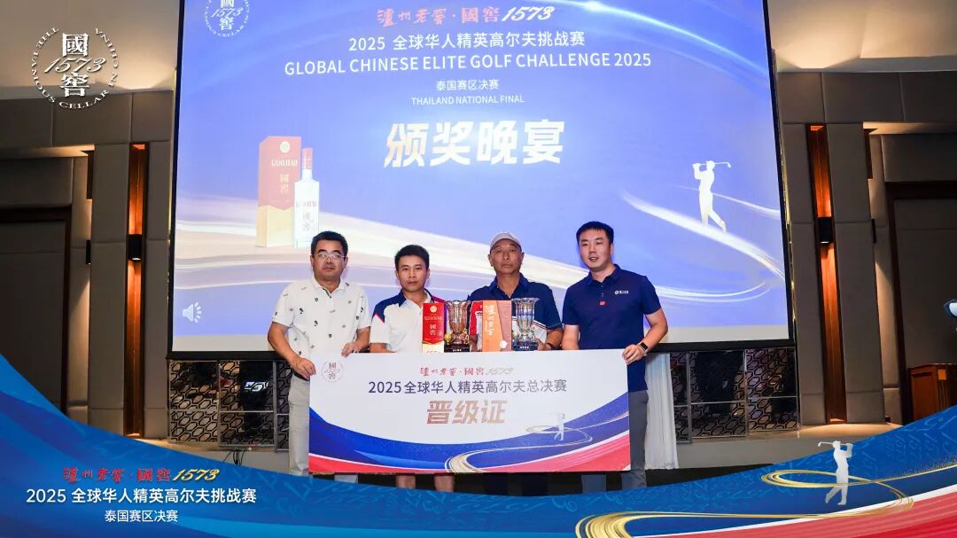 ▲ 泸州老窖国际发展(香港)有限公司东南亚销售经理王吉强(右一)、泸州老窖·国窖1573泰国官方合作经销商万先玉(左一)为晋级球员颁发晋级证