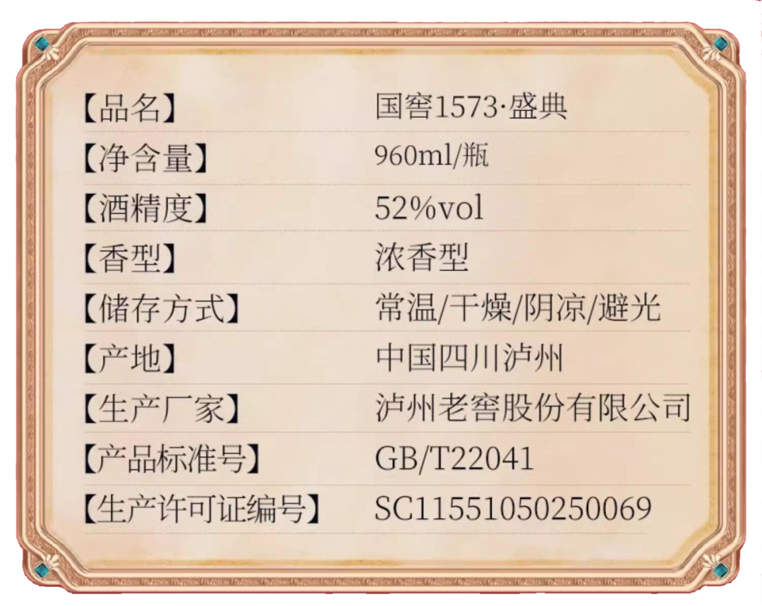 [盛典]为隆重的仪式、盛大的典礼!源自建造于明朝万历年间(即公元1573年)的“1573国宝窖池群”,采用国家级非物质文化遗产泸州老窖酒传统酿制技艺酿造,酒质纯净透亮、香味浓郁、窖香优雅、绵甜爽净、尾净香长。