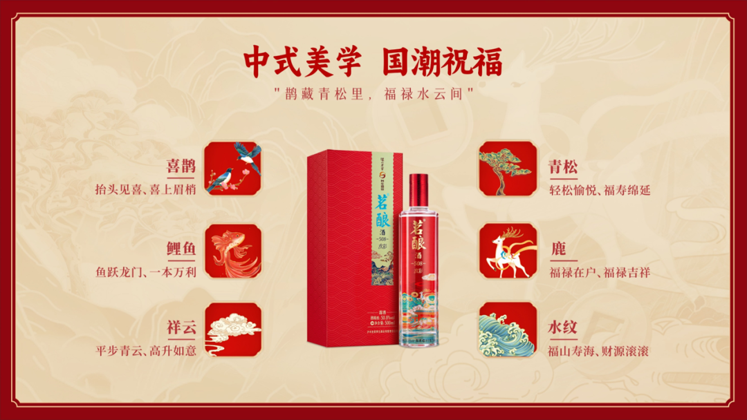 除了色彩给人喜上加喜的欢喜感,还在元素的选择上结合中国“喜”文化,巧妙地融入喜鹊、鲤鱼、祥云、鹿等形象,多种“尽欢”时刻,多场景适配。无论是家人团聚、朋友聚会,还是浪漫约会,茗酿·欢彩都能成为氛围的灵魂。家人齐聚,它是“合家欢”的桥梁;朋友小酌,它是“相见欢”的催化剂;婚礼现场,它则是“联欢”的点缀。轻松微醺,不需担心过量,只需享受片刻的放松与愉悦。