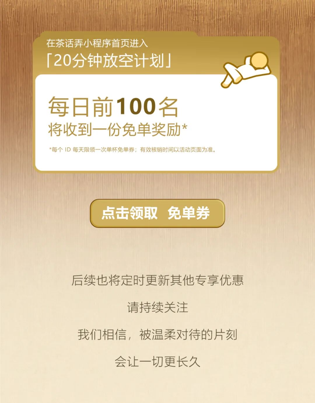 摘要:每天100张免单券,欢迎加入茶话弄20分钟放空计划!