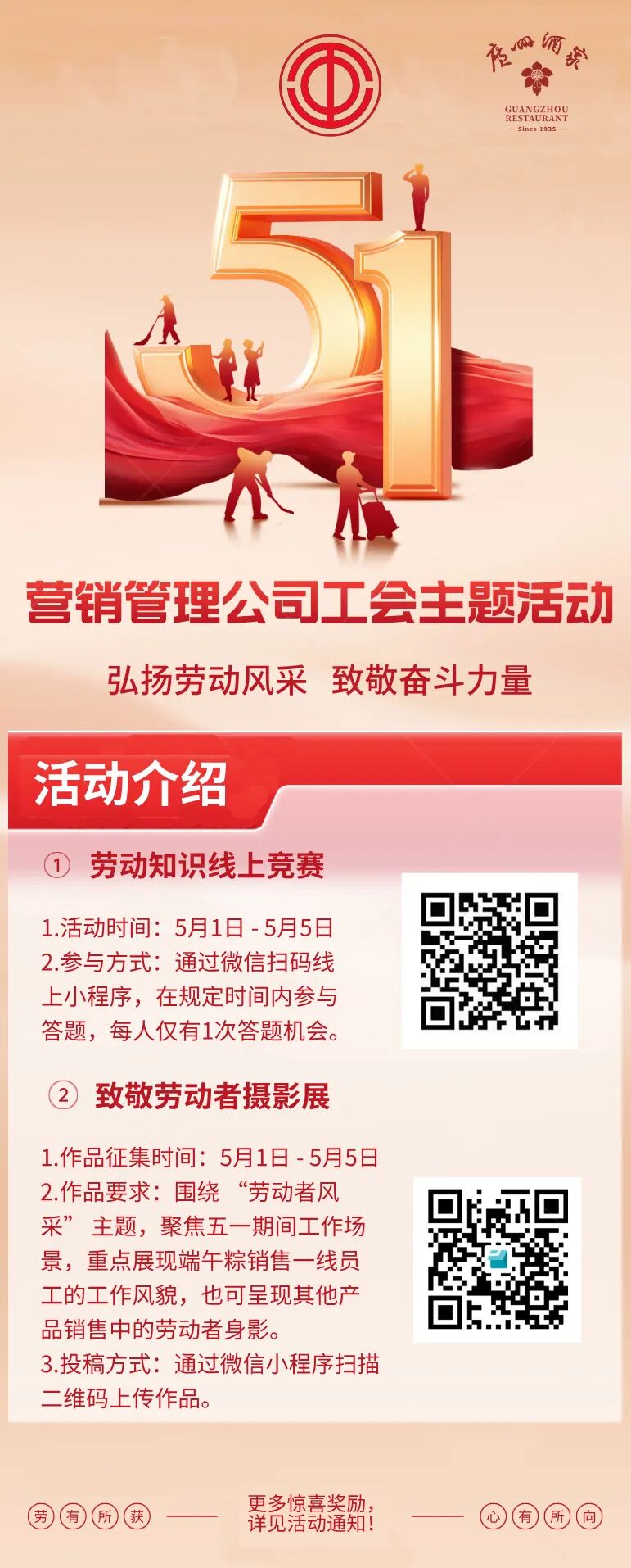 5月,广州酒家集团下属各基层工会和团组织积极开展职工子女升学关爱、中医健康咨询、退休座谈会、劳动知识竞赛、五四主题活动、“两癌”筛查等多项活动,进一步激发广大职工干事创业热情。下面一起看看各活动的精彩回顾吧!