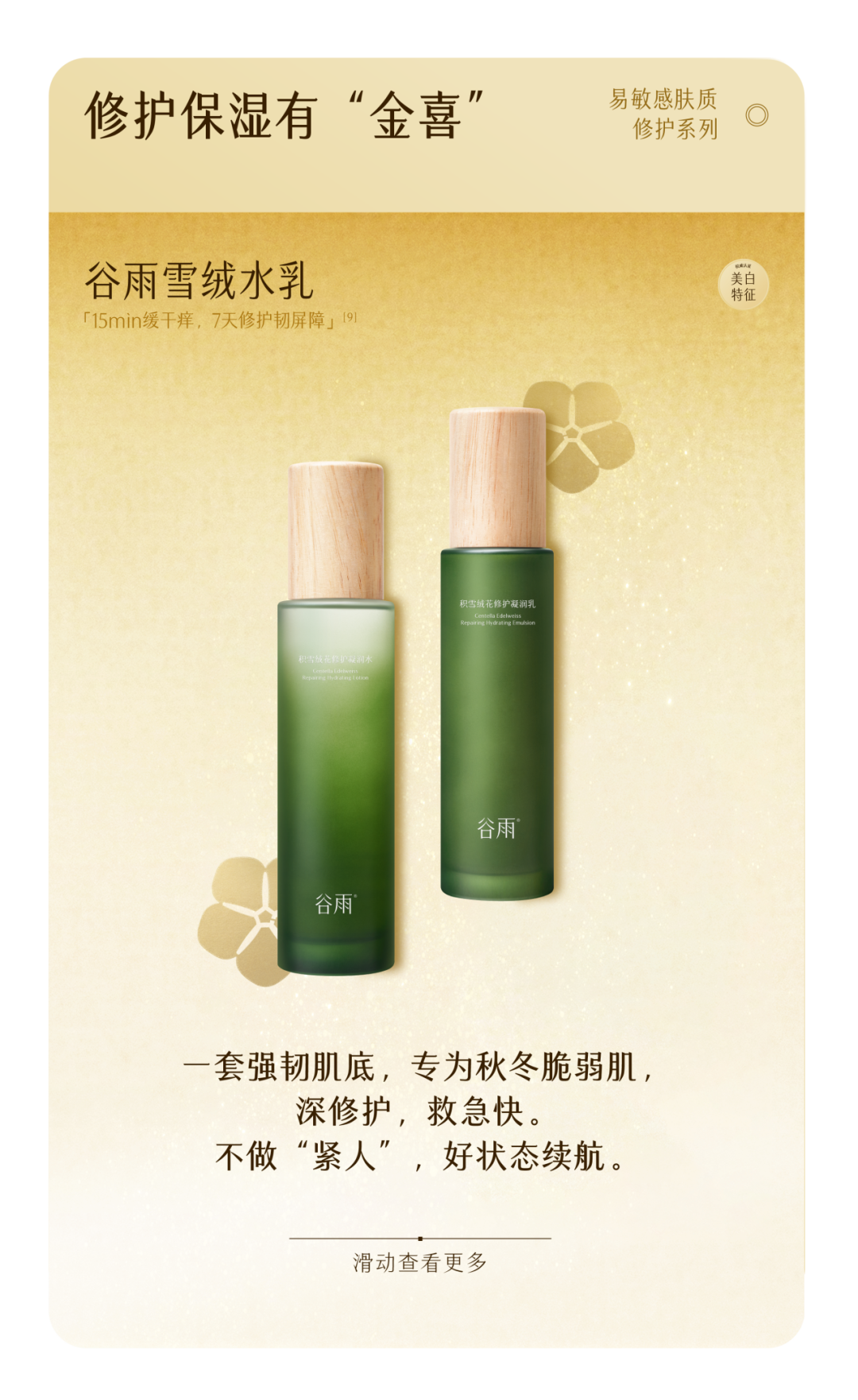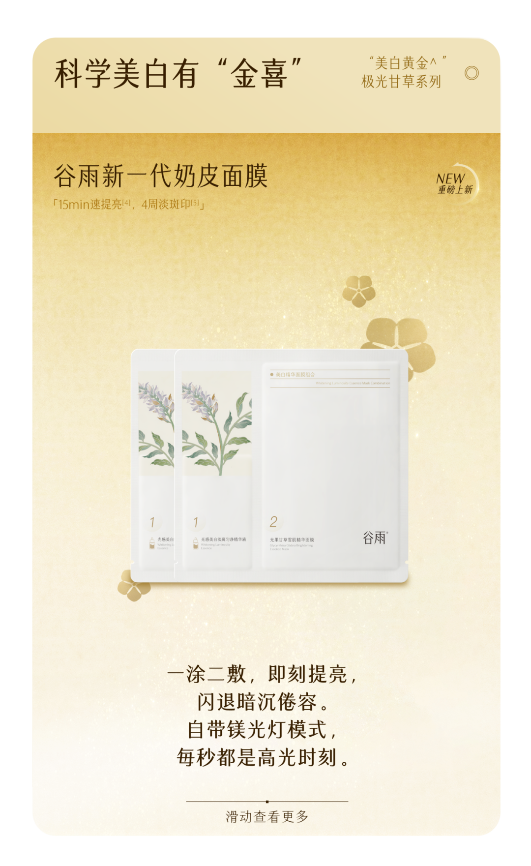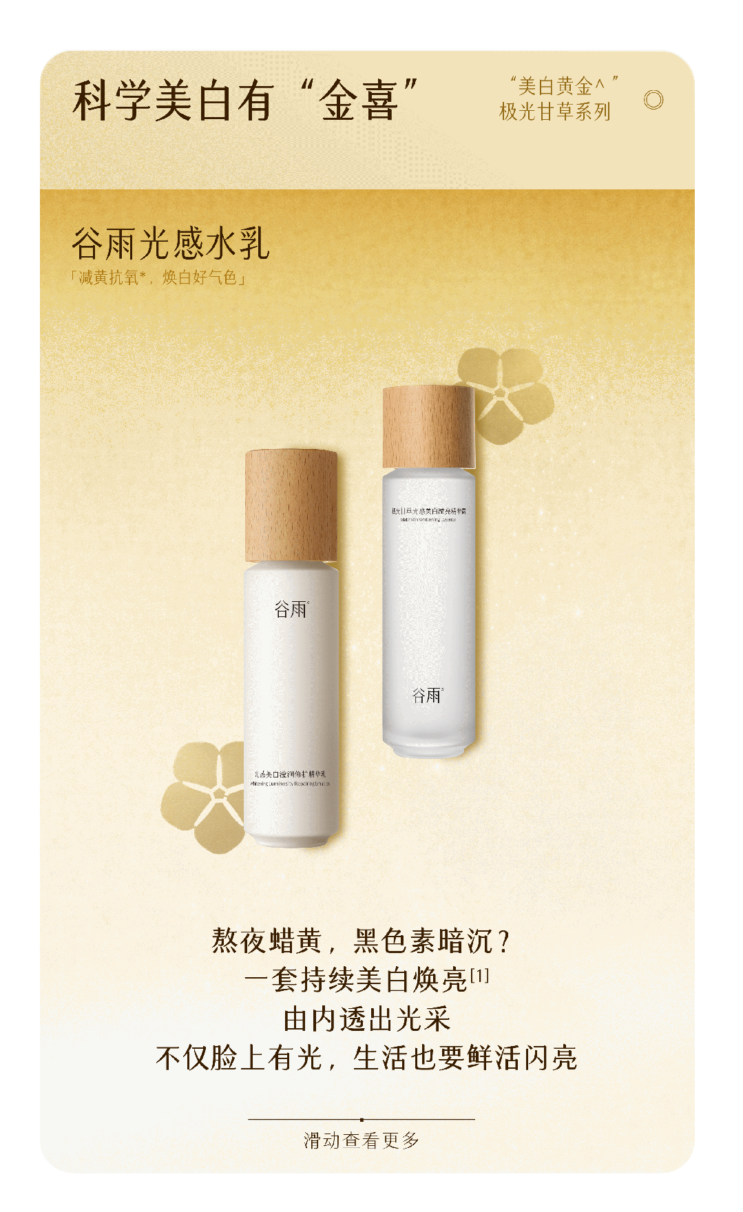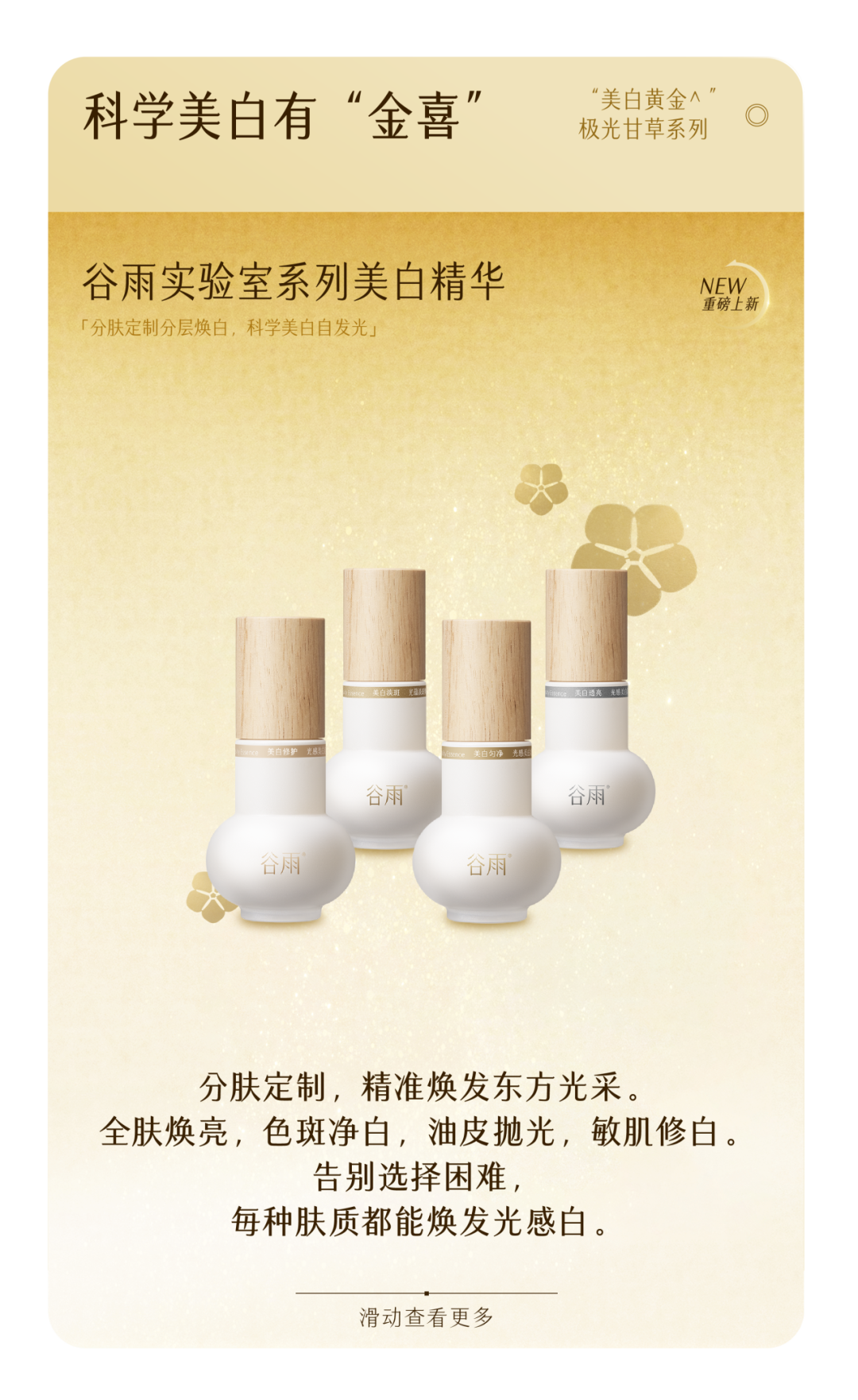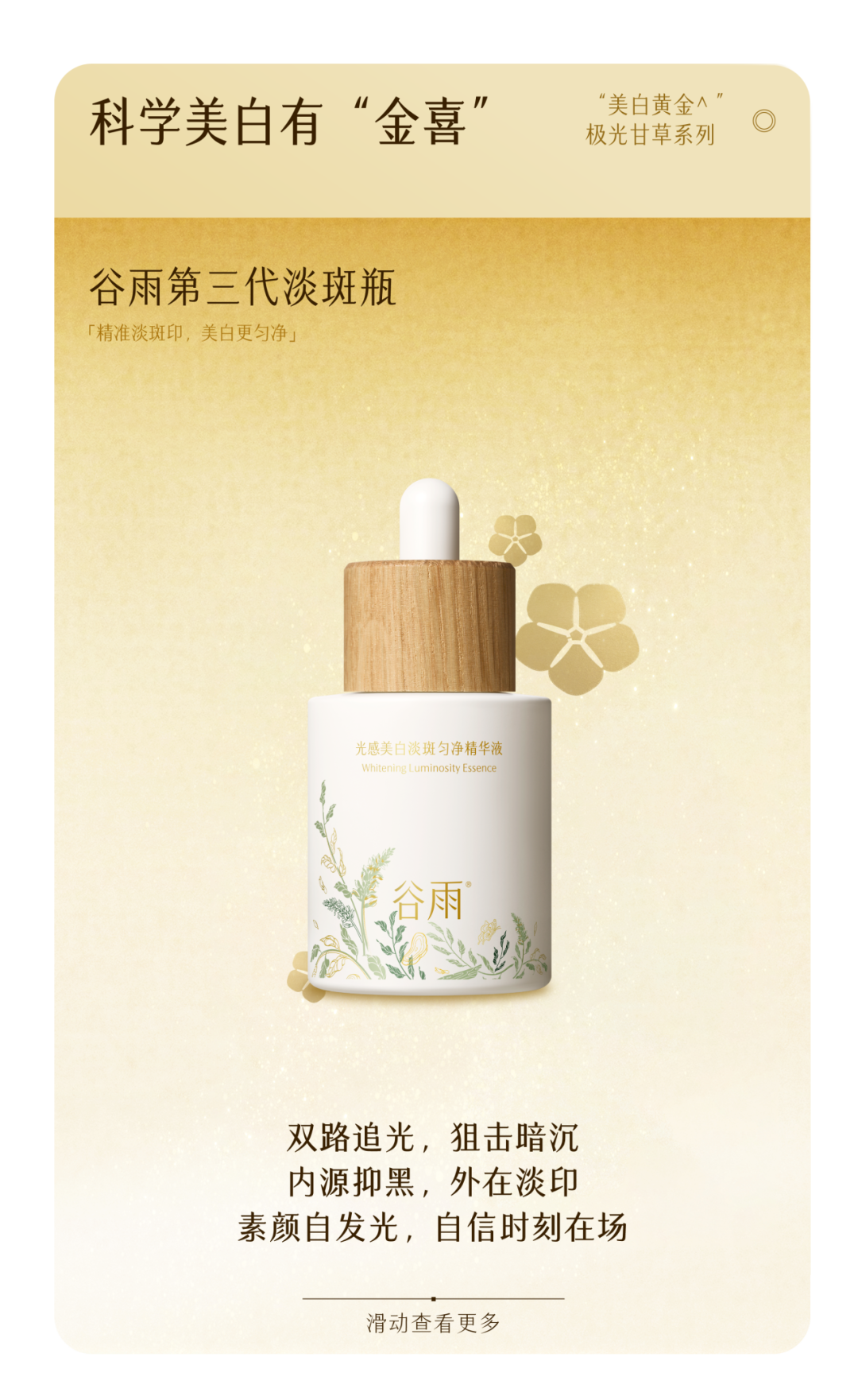 -谷雨,国内光甘草定美白开拓者和领导者。品牌起源于中国传统的“时节文化”,在深入研究中国人肤质特点的基础上,以创新科技力量,激发珍稀植萃能量,打造中国女性独有的新生白。