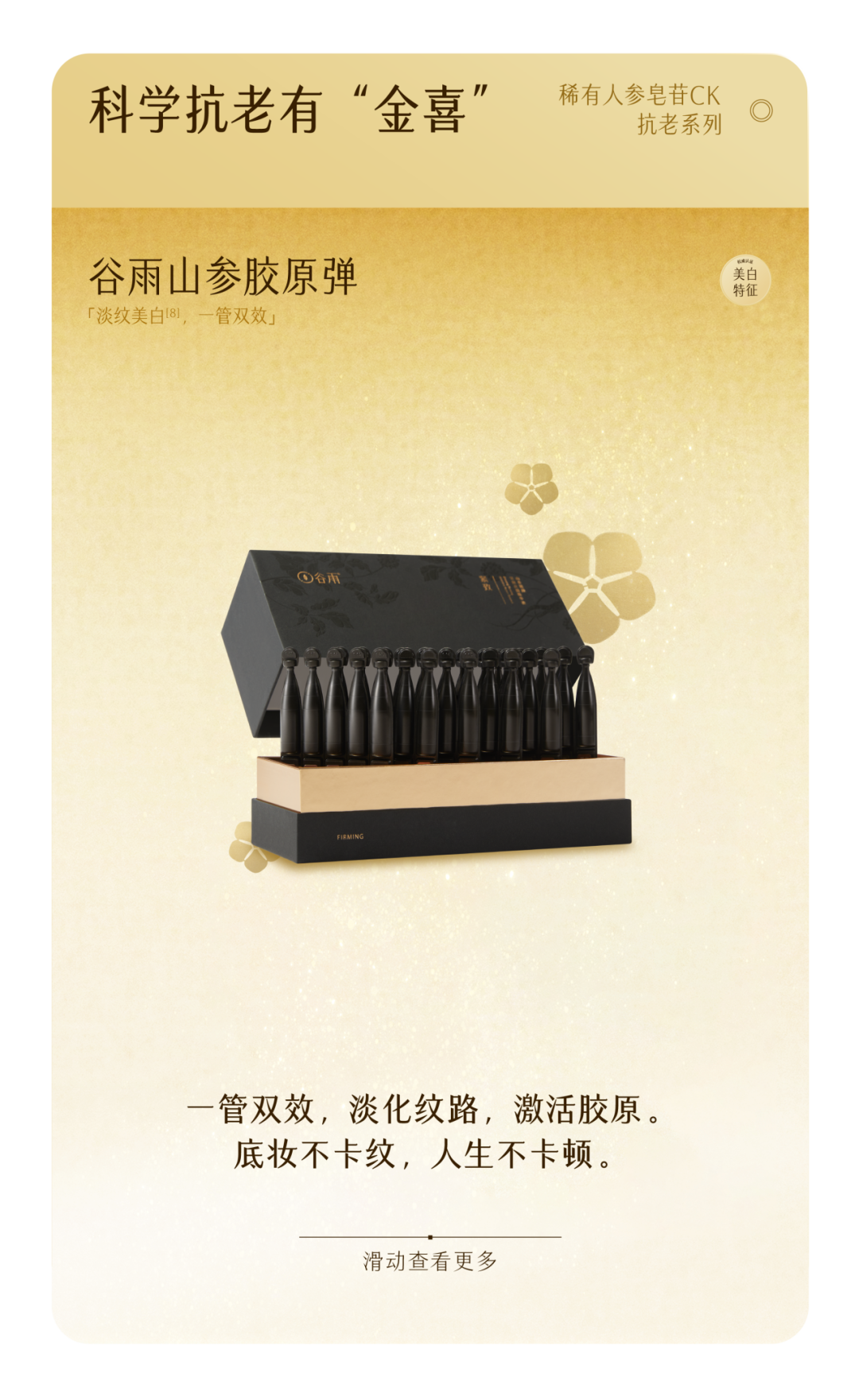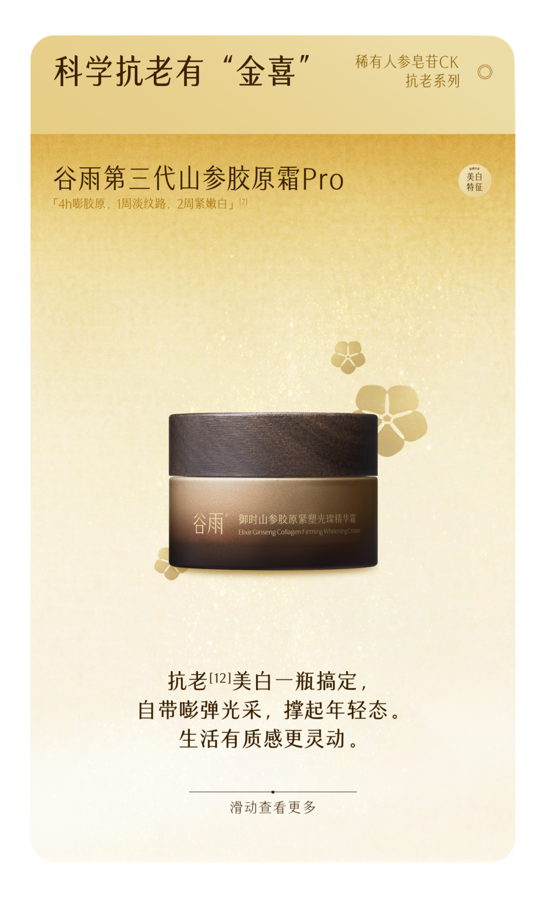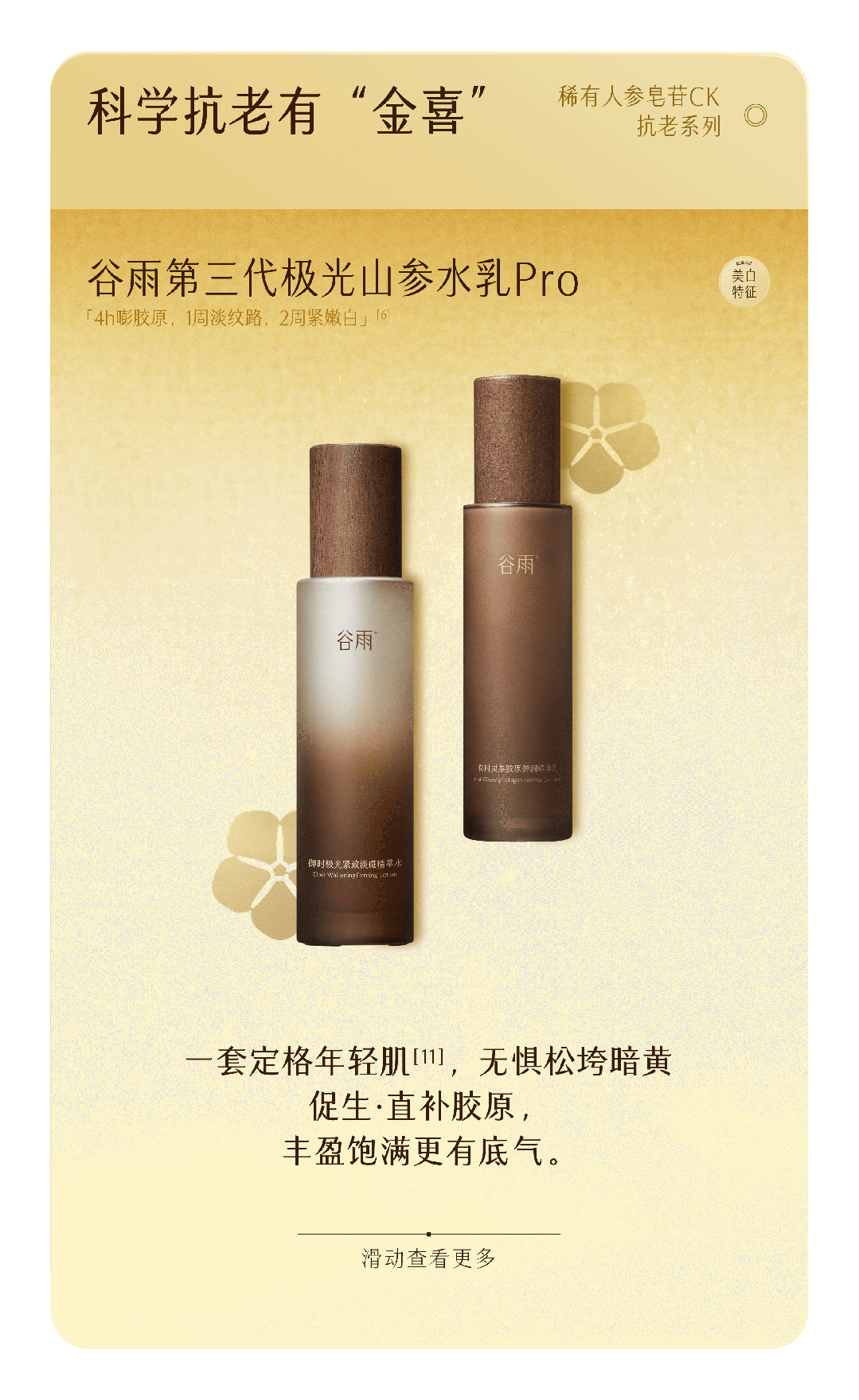 6.指活性物胶原4h穿透皮肤表皮层渗透至真皮层,数据源自上海微谱检测科技集团股份有限公司,报告编号为SHA01-22100223-JC-01;数据源自广州中科检技术检测有限公司报告,报告编号为EB250808-01.为32名40-58岁敏感性肌肤受试者在正常情况下使用谷雨御时灵参胶原弹润精华乳7天后通过仪器检测计算得出皮肤紧致度 F4 值、皮肤光泽度的数据,实际效果因人而异;“2周紧嫩白”数据源自华测检测认证集团股份有限公司、中检科健(天津)检验检测有限责任公司,报告编号分别为:HBR00586002、TIGT001720250713,指谷雨御时极光紧致淡斑精萃水、谷雨御时山参胶原紧塑光璨精华霜试验产品组的视觉肤色等级改善程度在使用后2周回访时间显著优于阴性对照组(p<0.05),试验产品组的视觉肤色等级回归系数与阴性对照组相比呈显著性改善(p<0.05),故认定其具有祛斑美白功效性。