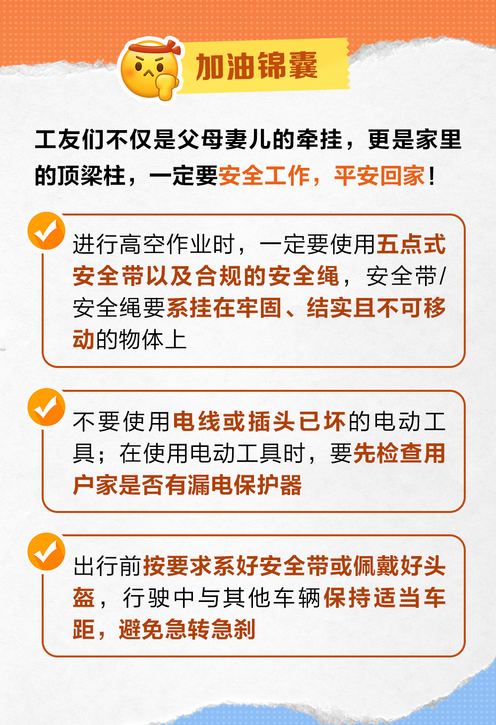 工友们不仅是父母妻儿的牵挂,更是家里的顶梁柱,一定要安全工作,平安回家!
