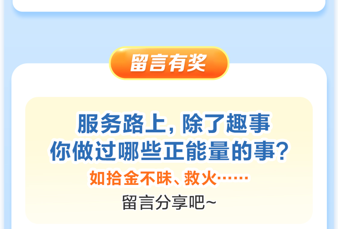 欢迎各位工友在留言区和小石分享:#服务路上,除了趣事,你做过哪些正能量的事?如拾金不昧、救火……#
