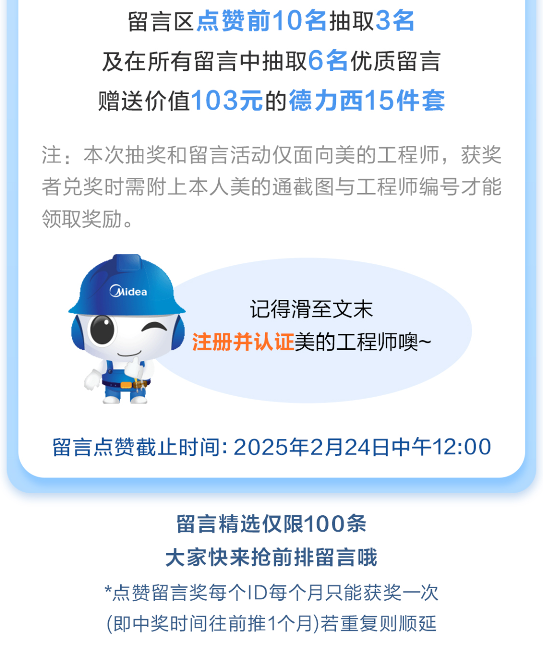 ✔ 参与留言话题,在留言区点赞前10名抽3名及在所有留言中抽取6名优质留言送德力西15件套!