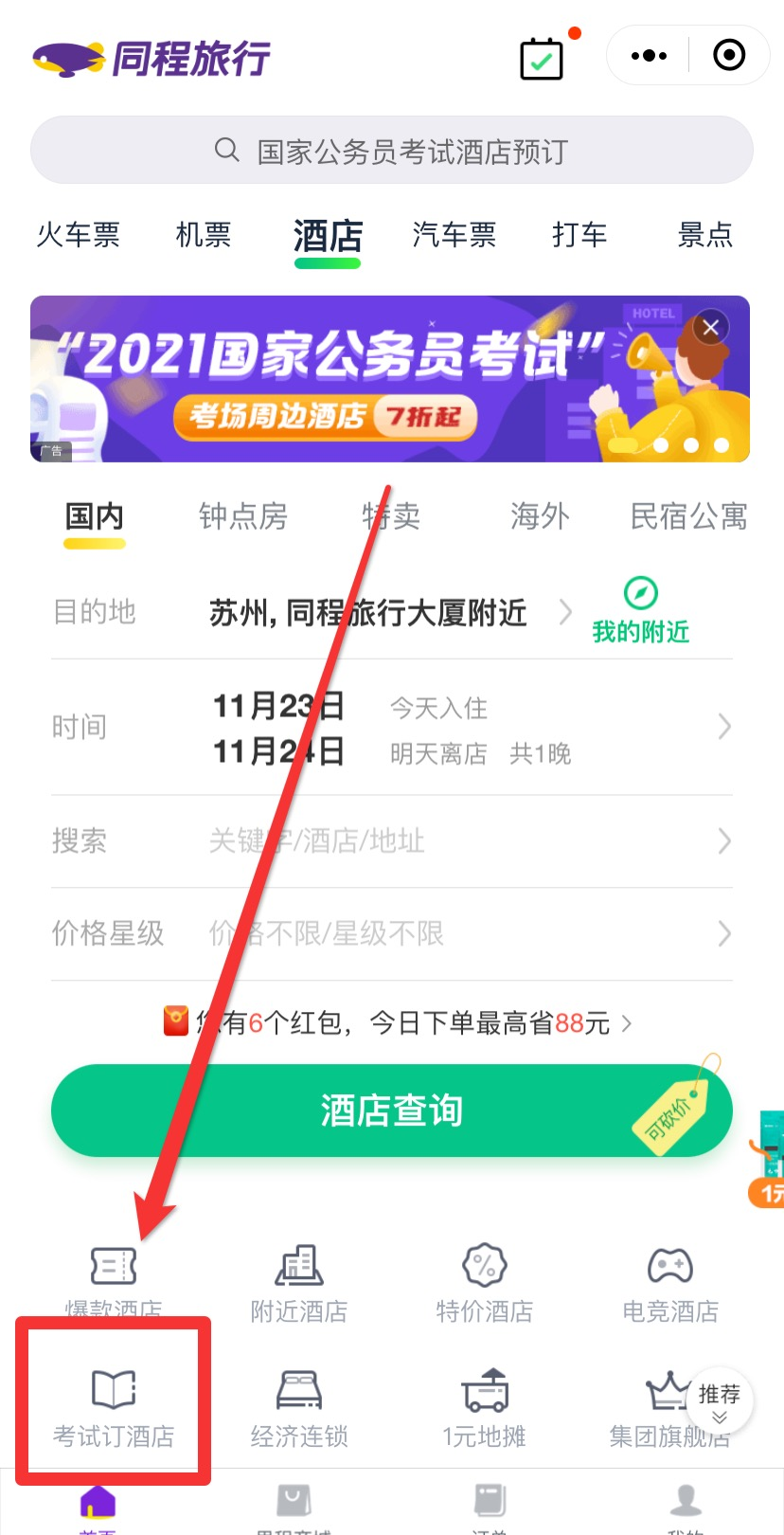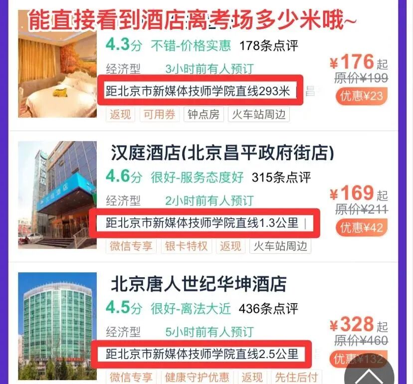 再下拉,可以根据需求,使用【距离远近】、【钟点房】、【经济连锁】等高级筛选!搜到考点后,请先通过同程小程序或app看一下考点周边酒店的分布状况,根据酒店到考点的距离来做选择。合适不合适,一目了然~下次怎么找到订房入口?在微信搜索【同程旅行】就可以看到入口啦!
