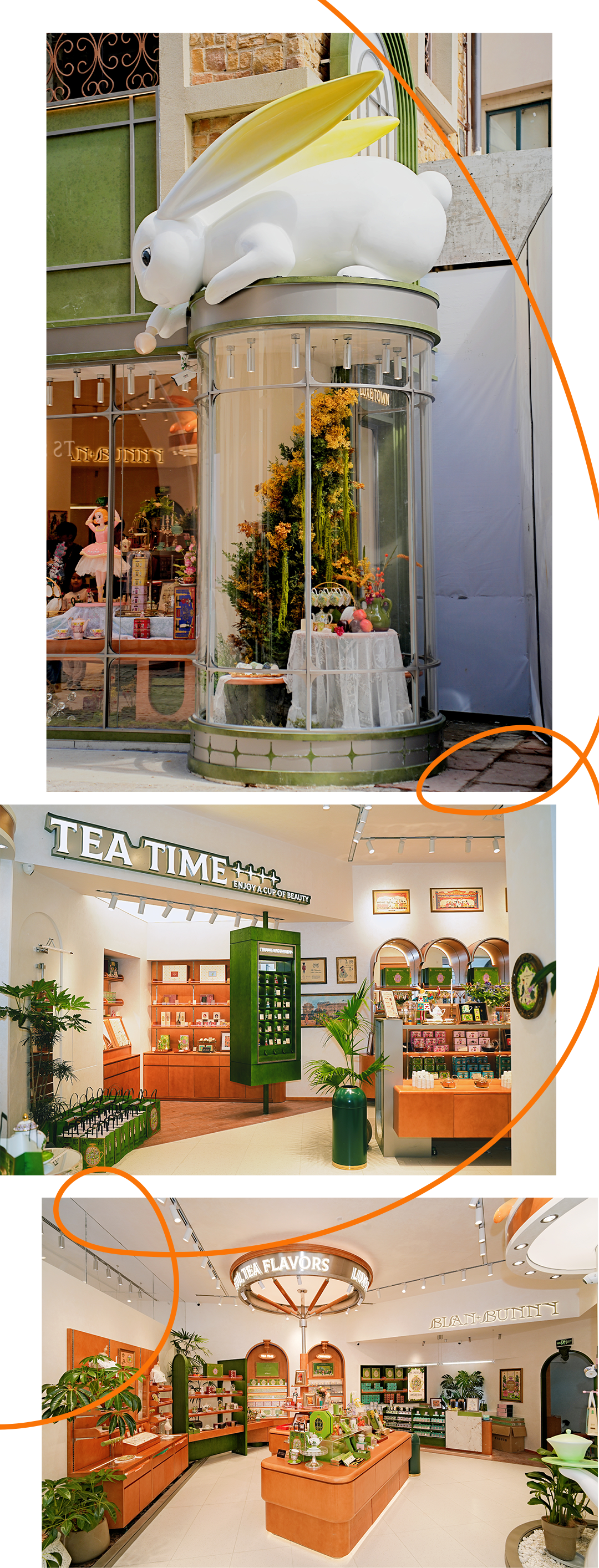 布兰兔麓镇店在品牌“千店千面”的空间体系下,既保留了品牌视觉DNA,也强调了成都自洽松弛的城市印象,以及麓镇托斯卡纳视觉风格,并从中提纯元素符号与色彩关系,做为品牌在地共创的首轮探索。门店整体空间自然、通透、梦幻,门头的巨型IP兔子雕塑,似乎在时刻速写描绘着一场场布兰兔与朋友们的浪漫邂逅,缤纷多彩的橱窗更是品牌以“场景化叙事” 营造出的美妙情绪入口。