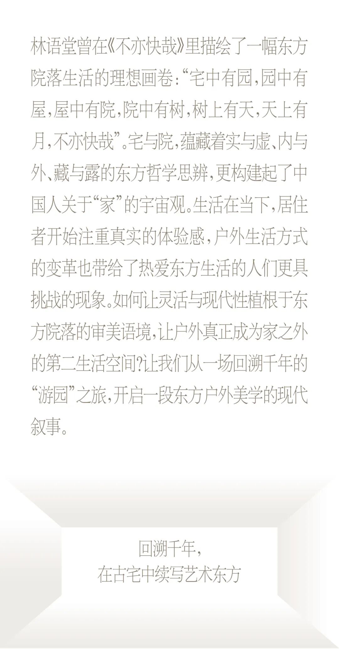 院半为现代生活创造了更多元的表达,让生活的趣味与心灵的滋养重回家的空间,续写属于中国人的生活浪漫。这恰恰也迎合了人们对长期主义生活的追求。“让户外空间不仅是当下的休憩场所,更是承载记忆、生长情感的心灵故乡,这正是东方院落精神在当代的鲜活表达。”