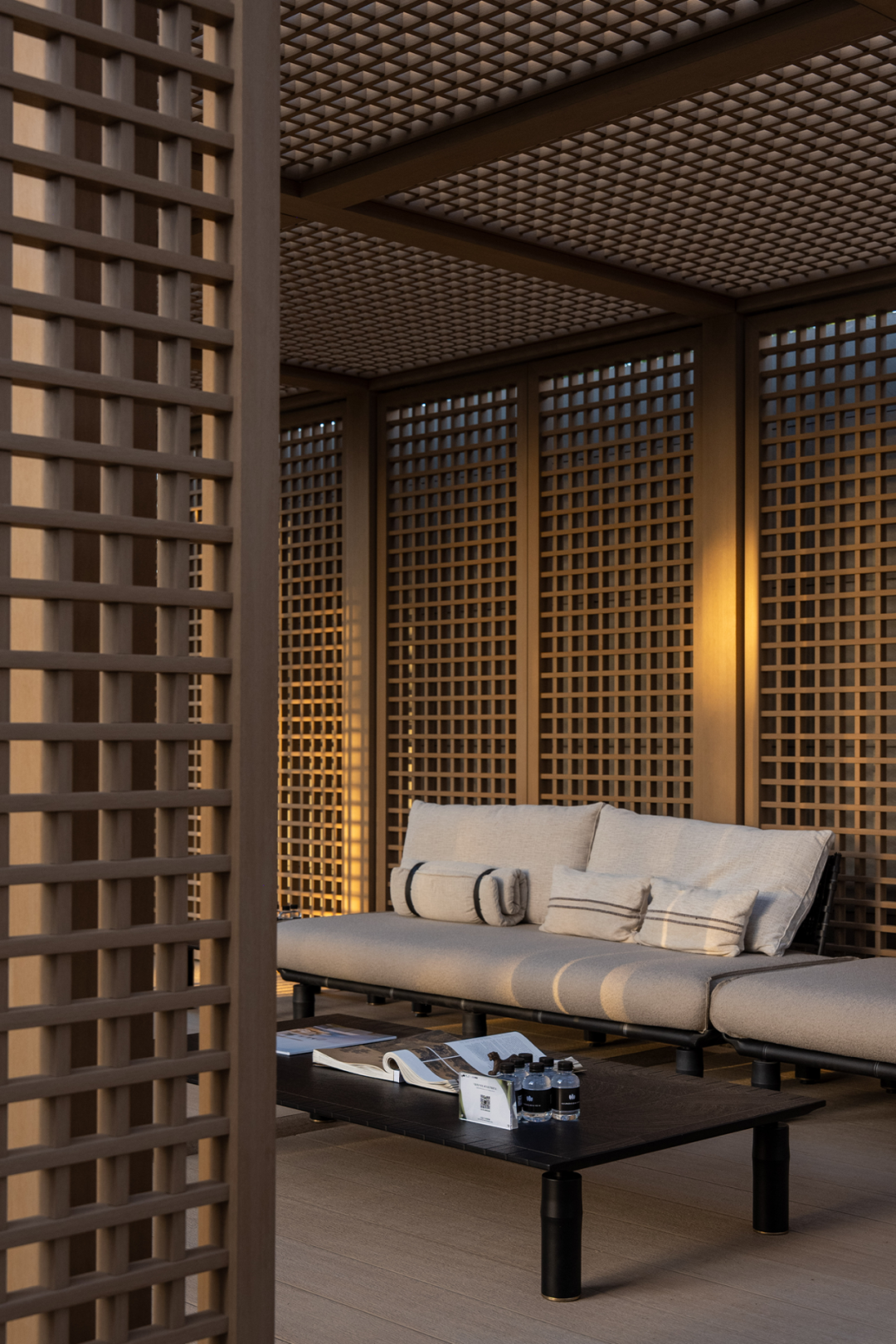 灵活的开合变化,满足了现代生活多变的场景需求,让同一场域呈现出截然不容的生活状态。它既可以实现与自然的无缝衔接,又让静谧独处的私享空间在室外获得最大的安全感。这种围合与开放并存的布局,也契合东方人“既重家庭凝聚、又重个体独立”的社交逻辑。除了保持外观调性的优雅,凉亭内里采用了院半晶钻木为核心材料,质感亲近自然的同时,也兼具了户外超强耐候性的实用需求。