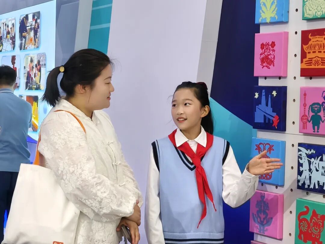 在展示中,杨浦区红领巾小记者团和少年宫戏剧社团的孩子们表现亮眼,他们不仅是现场的小小讲解员,更是非遗文化的小小传播者。以热情洋溢的态度和生动活泼的语言,为观众讲解非遗“智”造的亮点,成为现场一道亮丽风景线。