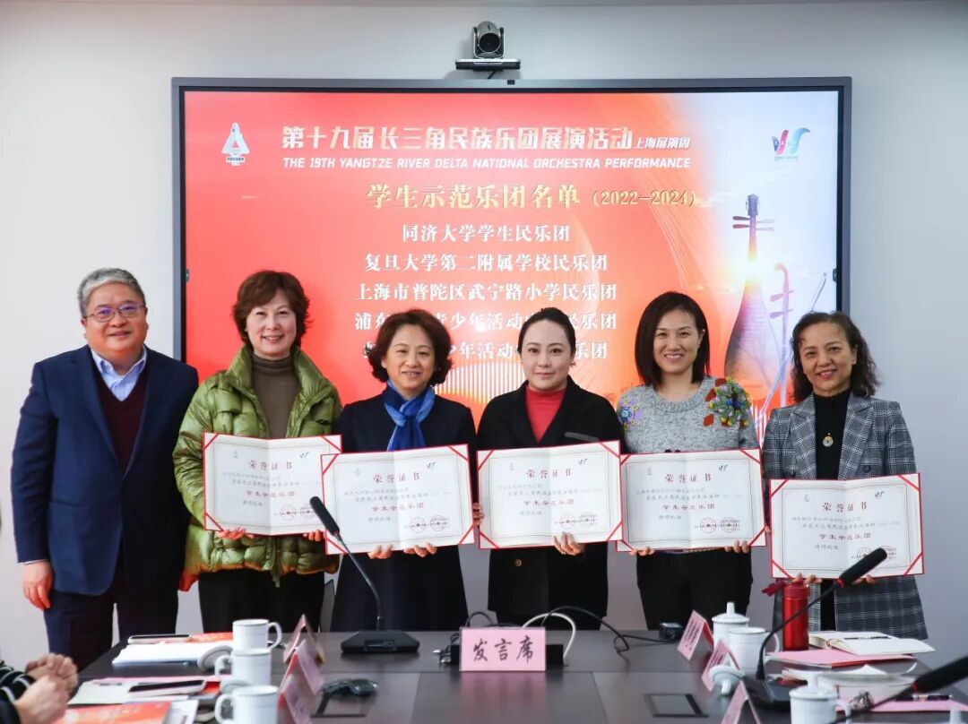 上海市科技艺术教育中心副主任田磊宣读第三批《长三角民族乐团展演活动——学生示范乐团》名单,并为同济大学学生民乐团、复旦大学第二附属学校民乐团、上海市普陀区武宁路小学民乐团、浦东新区青少年活动中心民乐团、虹口区青少年活动中心民乐团颁发证书。