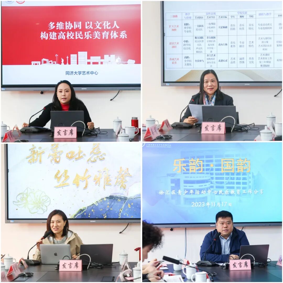 杨浦区少年宫副主任吴蕴主持会议,同济大学艺术中心副主任周芷如、上海音乐学院实验学校校长贾晓岚、普陀区武宁路小学副校长俞芳、徐汇区青少年活动中心副主任陈弘分别以《以美育人 以美化人》《向美而生 慧动而行》《新蕾吐蕊 丝竹雅馨》《乐韵 国韵》为题介绍了大中小民乐团发展建设与美育活动开展成果。