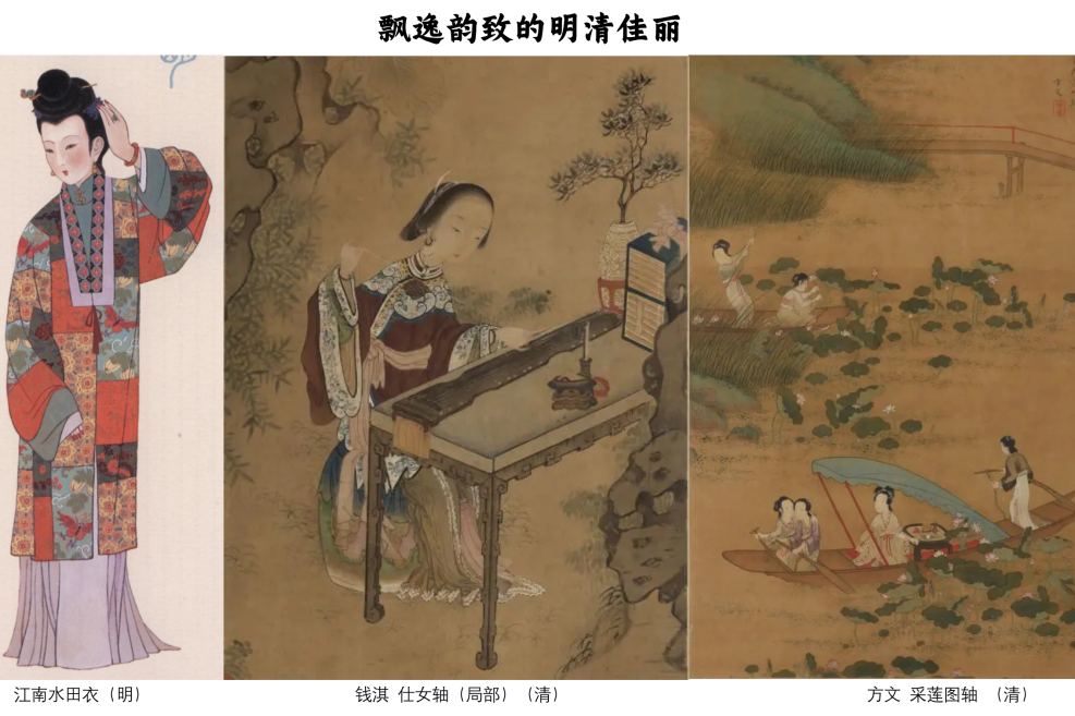 六朝“褒衣博带”展示了江南士人的翩翩风度,引领了时尚潮流;唐代纤秾繁丽的衣裙织满了江南的金银彩绣,彰显了江南生活的富庶优渥;宋人审美偏向内敛,江南色泽淡雅的衣物加上花草植物染色,馥郁芬芳,穿之心旷神怡。宋末元初纺织业在江南广泛发展,逐渐产生了“棉花织布胜绵绸”的境况。