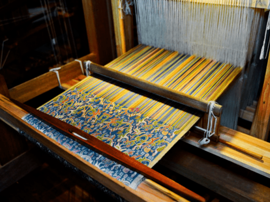 江南的古镇水乡傍依着运河湖泊,四处水网密布、草木繁茂。在溪影桑阴中,丝织业逐渐繁盛起来,江南的水质清冽、透明度极高,取以缫丝,光泽尤为可爱。“湖丝遍天下”、“广陵女子多擅绣”的说法渐渐传扬开来。