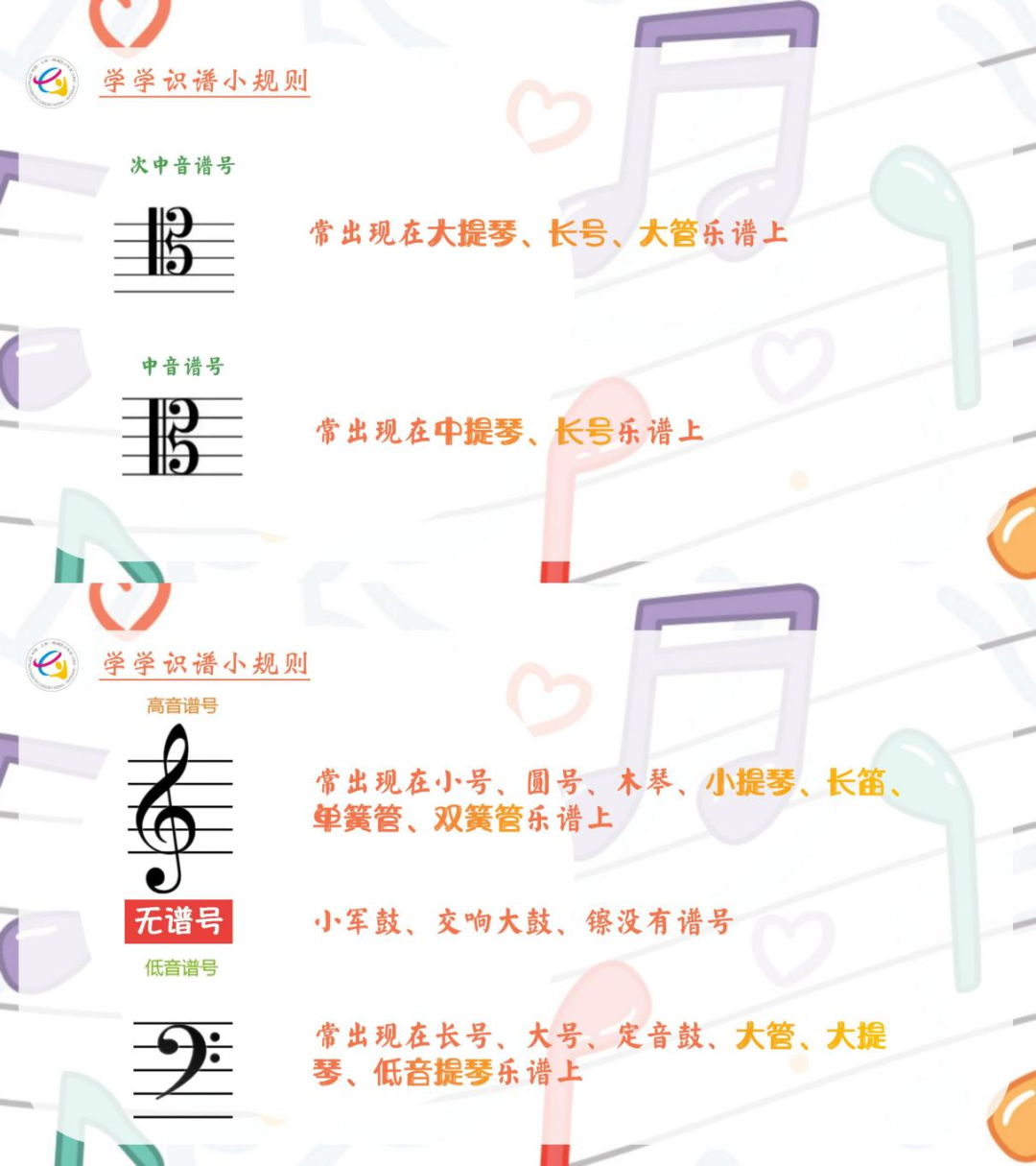 谱号是认识音高的基本规则,每个乐器都有属于自己的规则,当然同一种乐器也会同时使用多种谱号哦,老师给大家整理了一张表格,看看有你们已经学习演奏的乐器吗?
