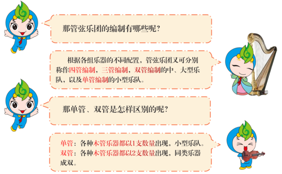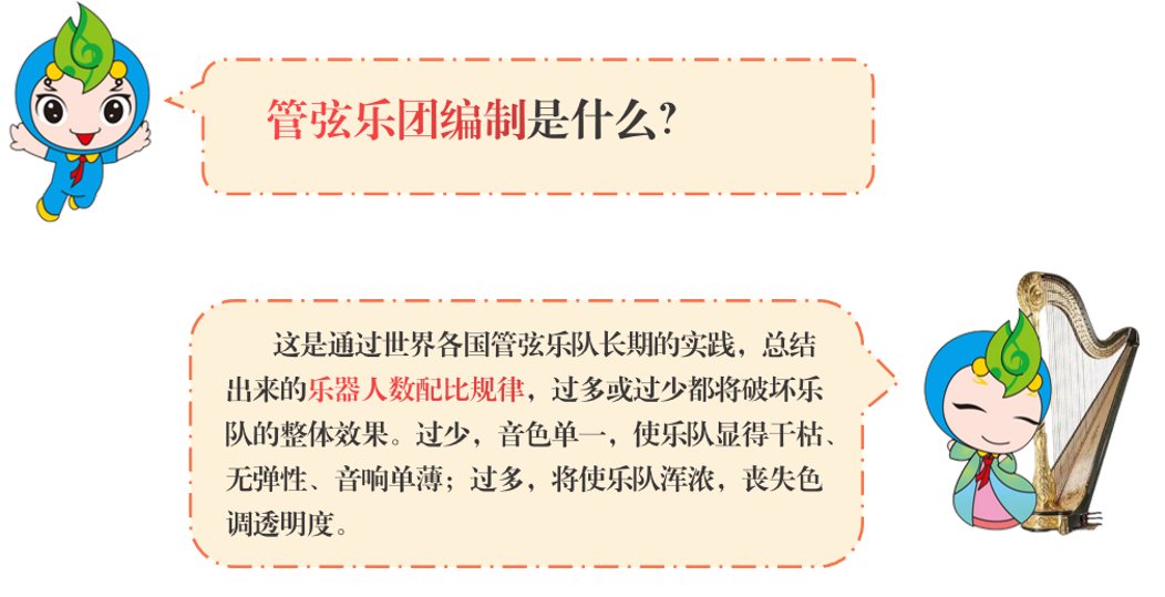 听了刚才的故事,老师帮大家再梳理两个知识点,小朋友们就能看到管弦乐团的全貌啦。