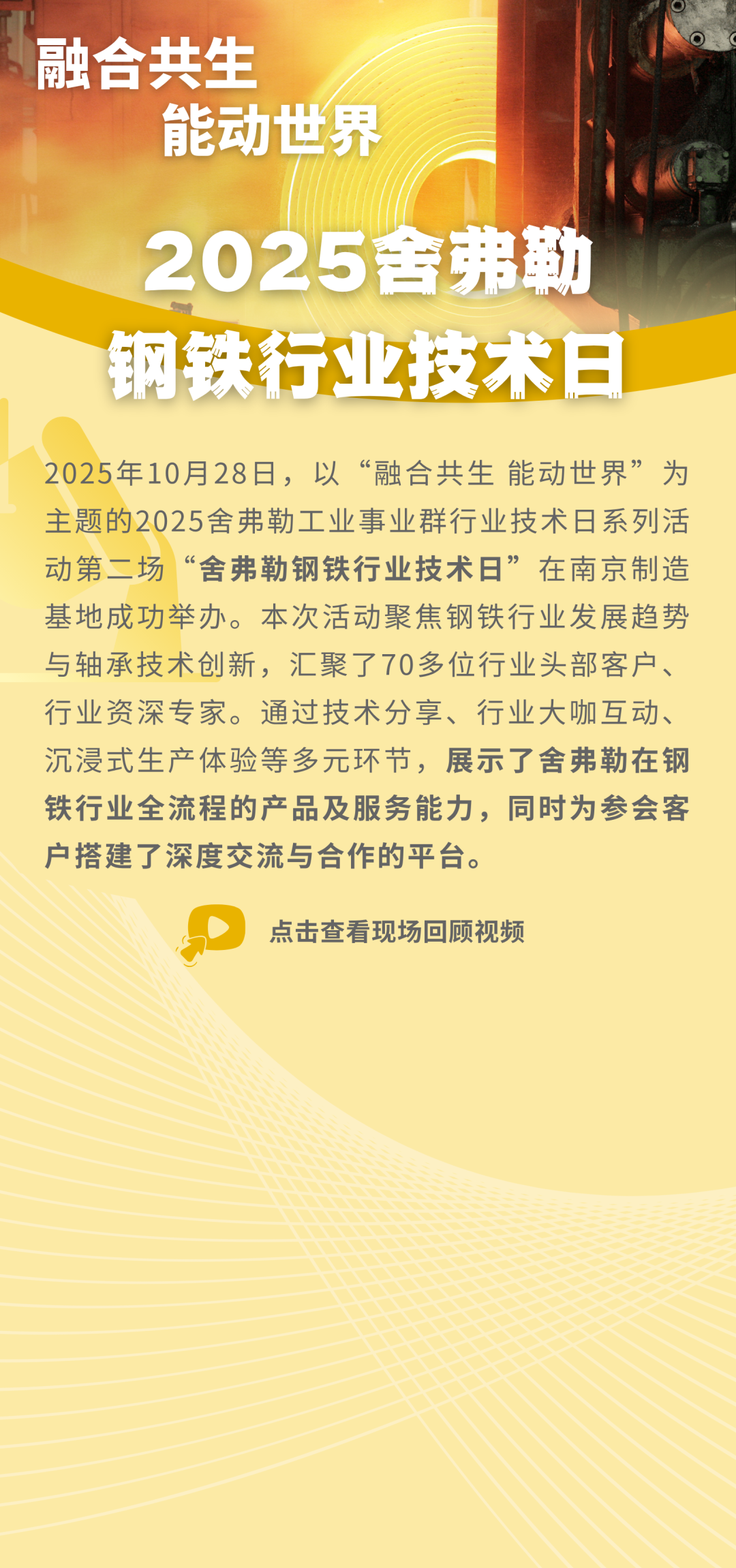 摘要:2025年10月28日,以“融合共生 能动世界”为主题的2025舍弗勒工业事业群行业技术日系列第二场“舍弗勒钢铁行业技术日”在舍弗勒南京制造基地成功举办。