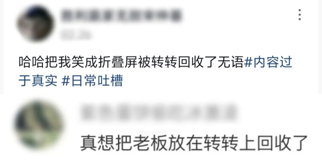 网友的玩梗能力也是不容小觑,在各种爆款视频下,总能看到这些抽象评论的身影:笑成折叠屏被转转回收了、真想把老板放在转转上回收了、把这不值钱的眼泪放转转上回收了。