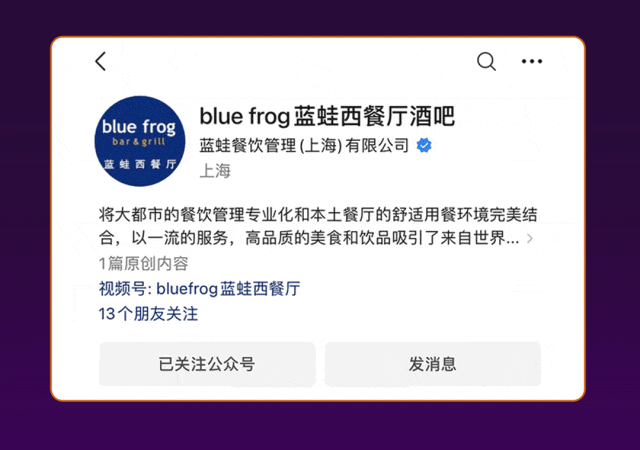 文章内容来源于公众号:blue frog蓝蛙西餐厅酒吧,点此可查看原文,内容版权归相关企业所有,本网站仅供交流学习。若涉及版权问题或存在侵权情况,请及时与我们联系,我们将第一时间进行删除处理。
