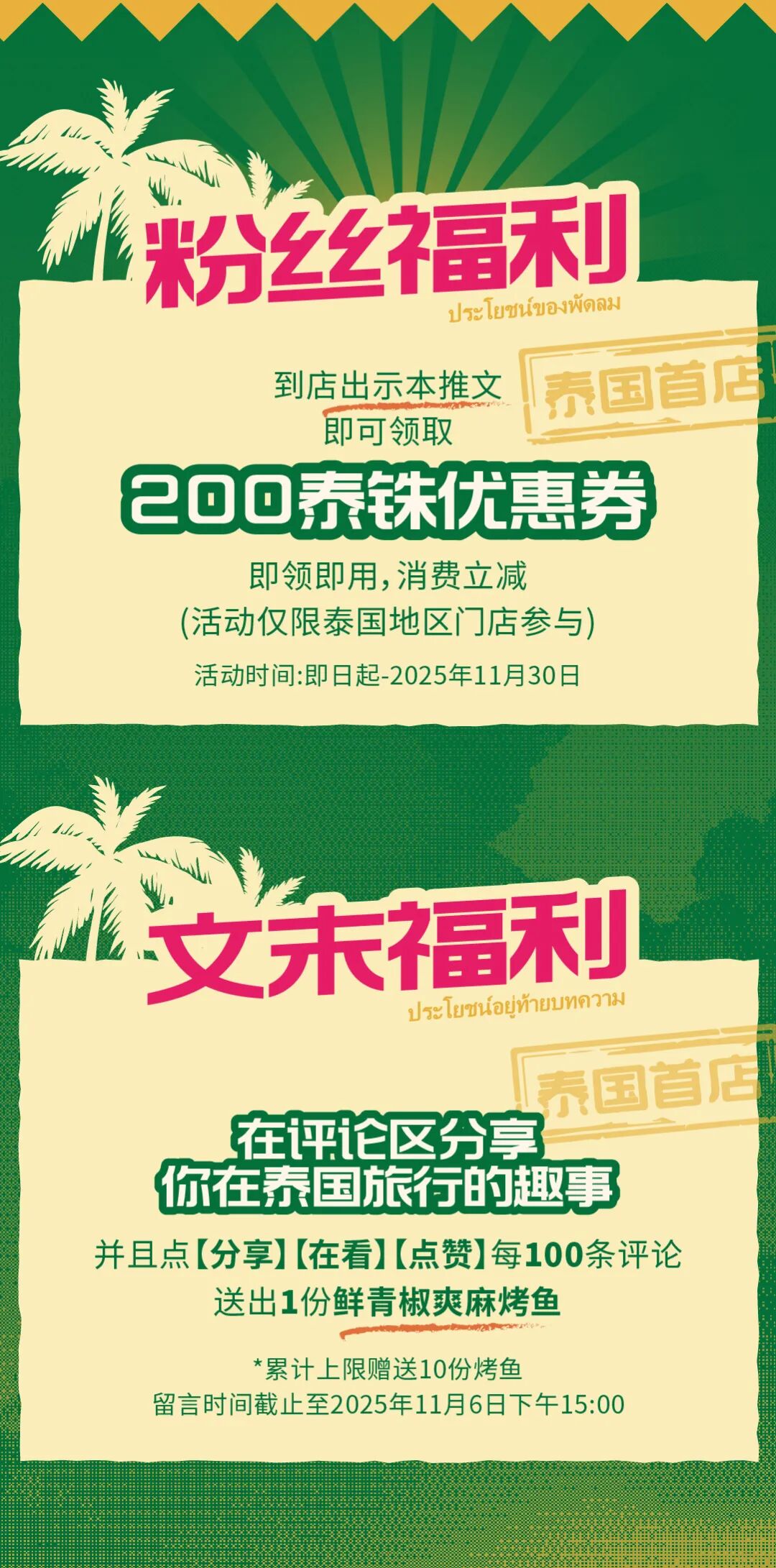 注:1.推文留言活动时间:2025年10月31日-2025年11月6日,2025年11月7日将在留言区公布留言中奖名单,奖品为鲜青椒爽麻烤鱼一份;2.奖品以卡券形式发放至会员卡包,具体卡券有效期与使用规则,可在【探鱼烤鱼】小程序 -【我的】-【优惠券】卡券详情中查看;3.仅限大陆地区探鱼餐厅堂食使用,华为店不参与活动;4.每个订单仅可使用一张卡券,不可与其他优惠同享,餐前不设外带;