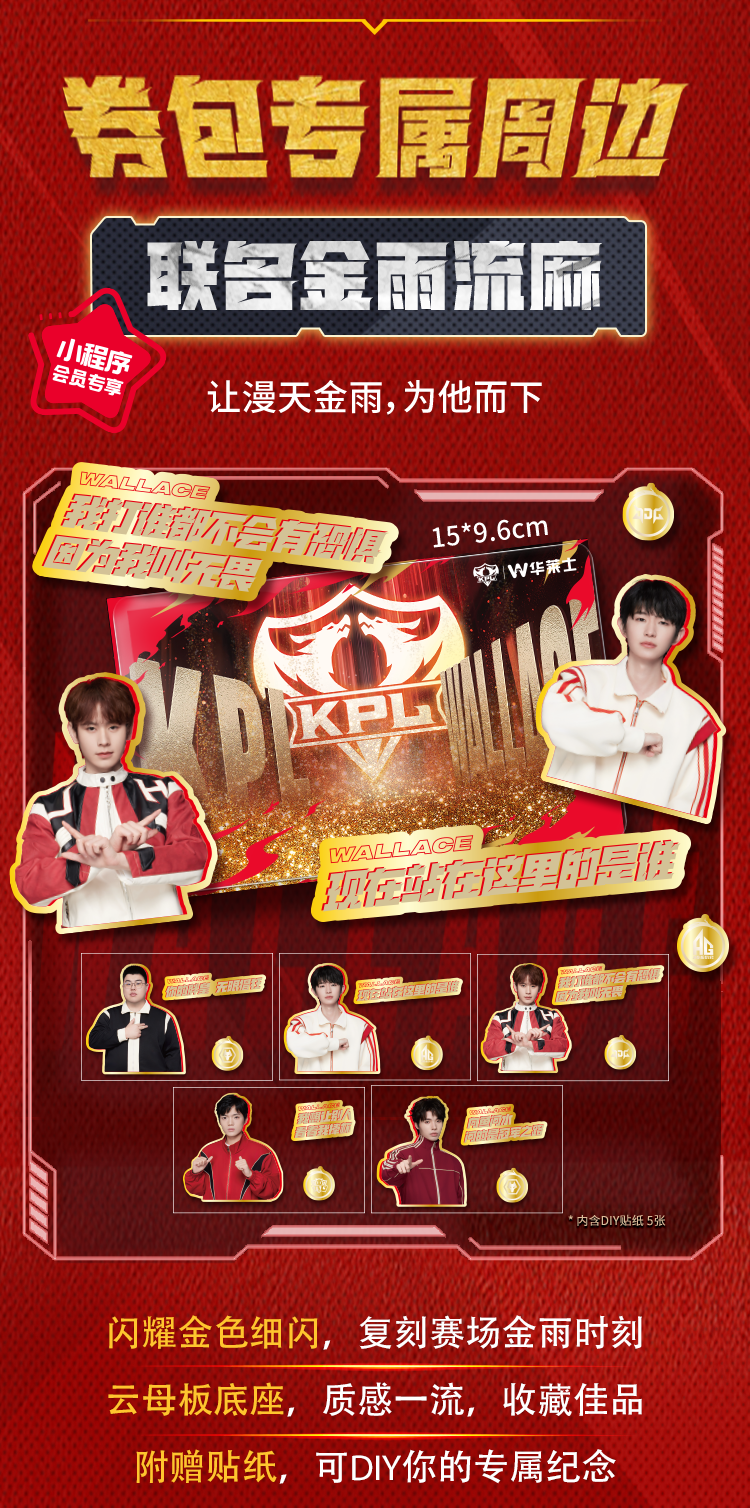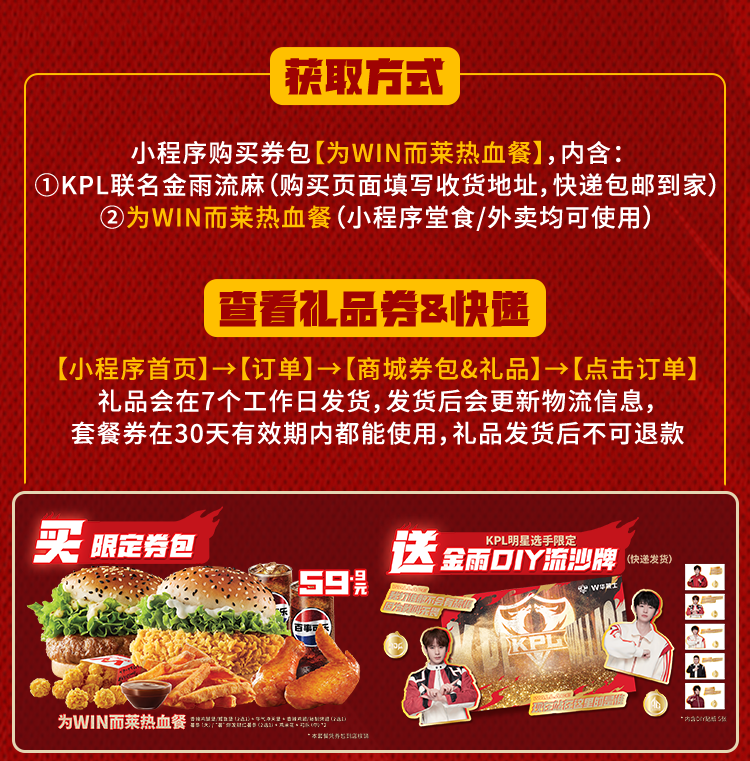 活动期间每人(或每个用户ID)仅限购买5个券包。券包购买后,【KPL明星选手限定金雨流沙牌】最快7个工作日内发货,礼品发货后不支持退款。券包具体活动规则可扫码进入华莱士自助点餐小程序在商品详情页查看。