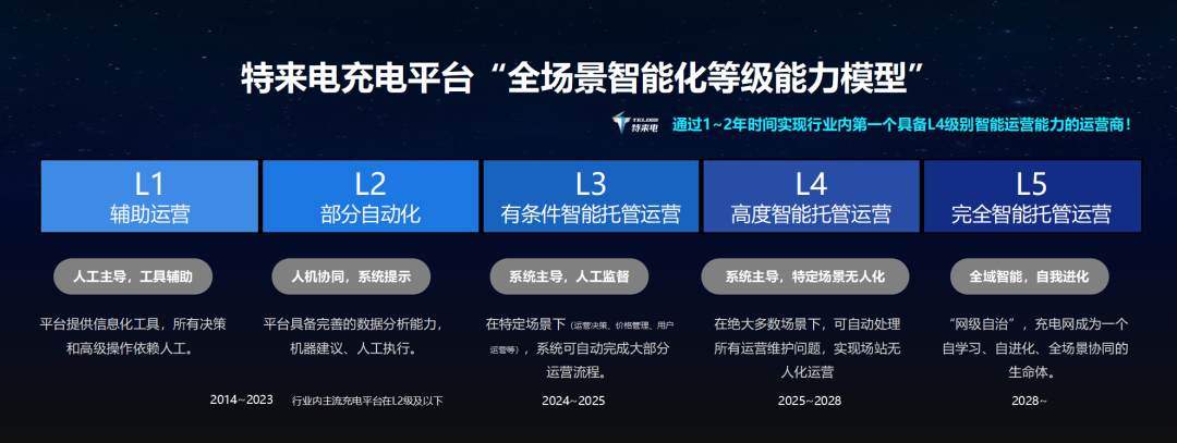 全场景智能化新一代数字化平台以“L1至L5全场景智能化等级能力模型”为核心框架,重构全场景智能充电网运营逻辑,解决充电运营从“拼数量”到“拼质量”转型挑战。