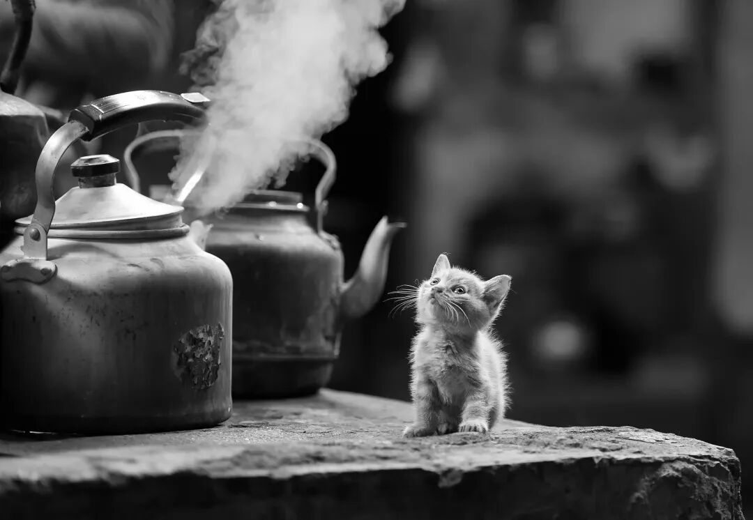 出生不到两个月的小猫,出神地望着烧开的水壶。小猫已夭折。拍摄时间2016年。