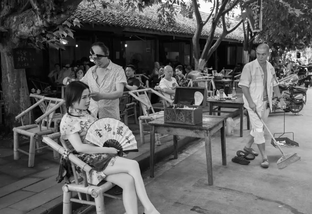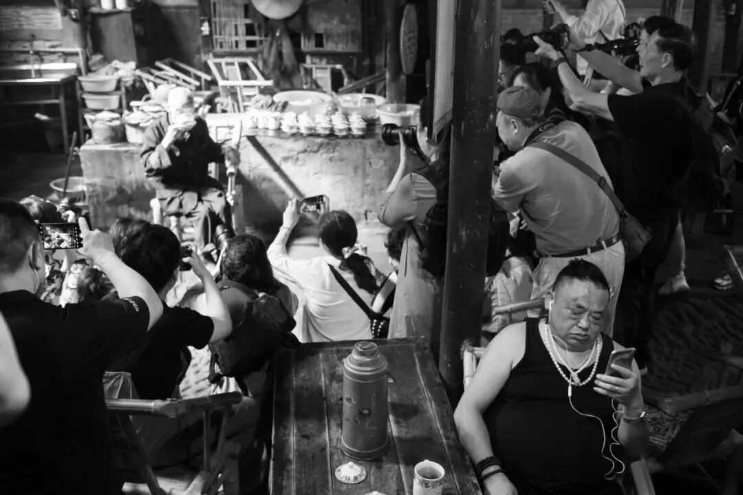 对于这种变化,钟跃民一开始也有一些反感,觉得打卡文化破坏了茶馆的滋味,“长枪短炮的在茶馆里舞什么舞”。后来是著名摄影家陈锦开导了他:其实这种变迁也应该被记录下来。