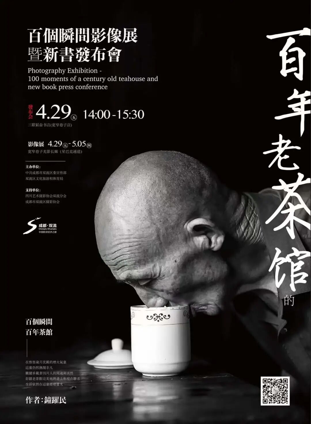 用时间的艺术记录双流彭镇老茶馆的传统与新生,在百个瞬间中感受深藏百年的烟火与生命之美。本次摄影展全面展示双流彭镇老茶馆的风貌和人情的摄影作品,将于4月29日至5月5日期间,在宽窄巷子的星巴克长廊中,为市民、游客讲述一段光阴岁月与茶客人生的故事。
