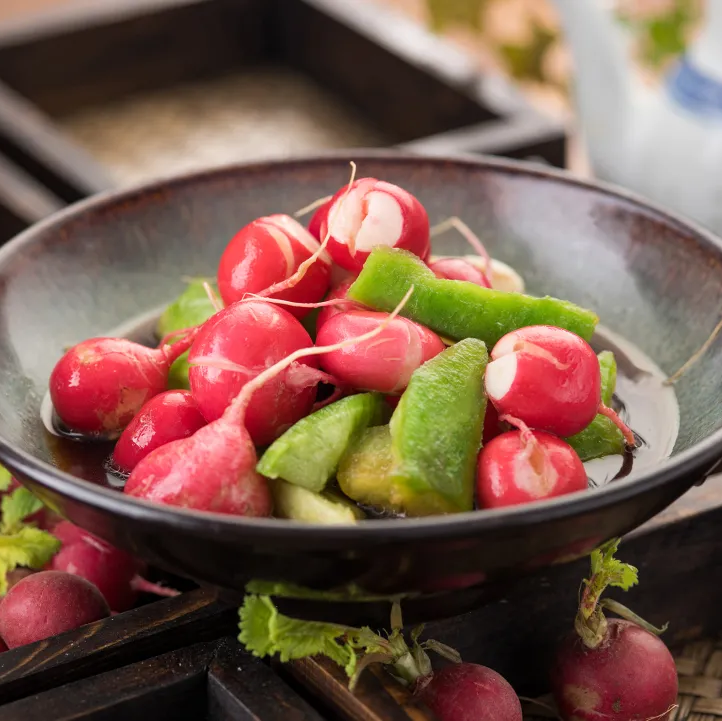 红润饱满的杨花萝卜与青皮萝卜一起浸在糖醋里,红绿相间好不诱人,让味蕾感受浓浓春意。