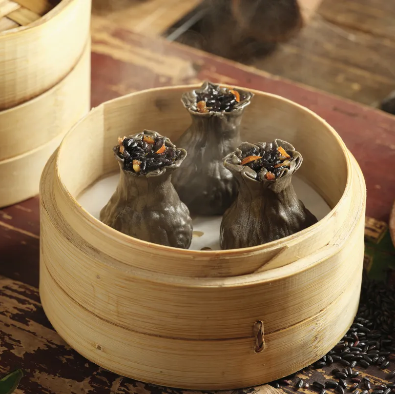 江南的南烛叶捶打成汁,浸泡蒸制的乌米浸入烤鸭油,再以黑色皮手工包制烧麦,喷香解馋。