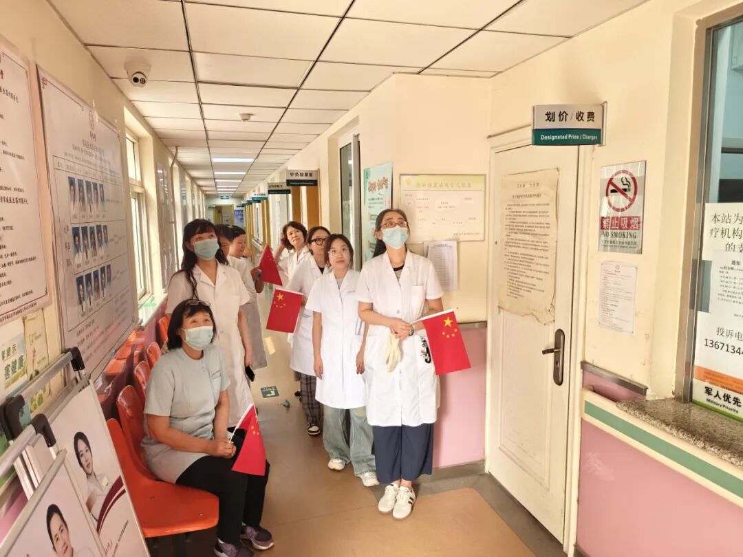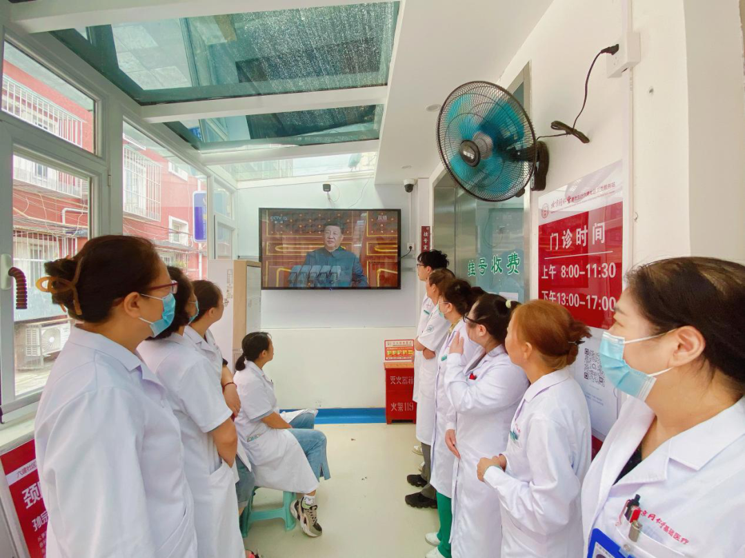 海淀区六建社区卫生服务站职工坚守岗位,确保服务“不打烊”,站内组织在岗人员共同观看大会直播,大家备受鼓舞,纷纷表示将弘扬伟大抗战精神,继续为居民健康保驾护航,让伟大抗战精神在新时代绽放出为民服务的新光芒。平凡的岗位,不平凡的奉献,基层医护人员用实际行动践行“服务为民,守岗为责”的信念,将爱国情怀融入点点滴滴的日常工作中。