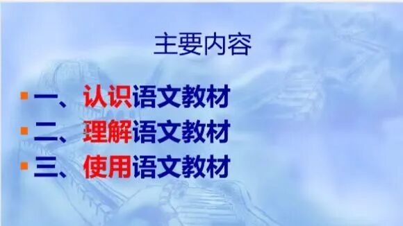 顾之川老师本次讲座的内容主要分为三个部分:(1)认识语文教材;(2)理解语文教材;(3)使用语文教材。