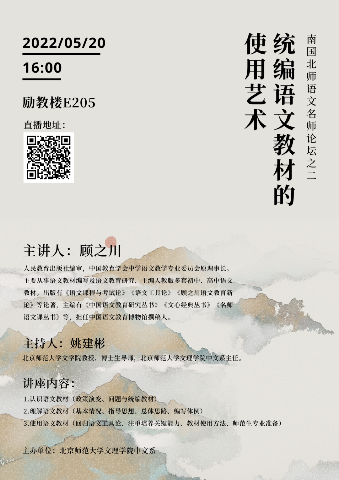 2022年5月20日,“南国北师语文名师论坛之二:统编语文教材的使用艺术”讲座在北京师范大学珠海校区励教楼E205教室顺利举行。本次讲座,由北京师范大学文理学院中文系主办,有幸邀请到了人民教育出版社编审顾之川老师担任主讲嘉宾、北京师范大学文学院研究员吴欣歆老师担任主持人。由于疫情原因,本次讲座采用线上、线下相结合的方式进行,报名在现场聆听讲座的超过90人,通过学术志直播平台在线观看讲座的超过1800人次。