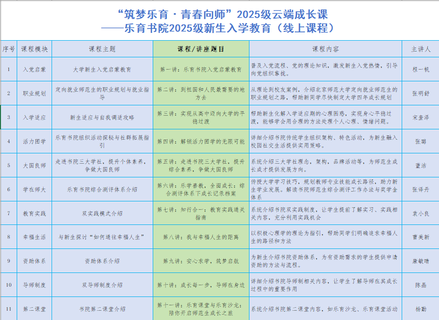 书院为2025级新生精心筹备了“筑梦乐育・青春向师”云端成长课系列微课,涵盖思想引领、入学适应、书院生活、成长规划、身心关怀和专业启航六大模块。该系列课堂通过十一门主题课程,系统性地介绍了入党启蒙、职业规划、心理调适、学生组织、三大学社、综合测评、教育实践、资助体系及导师制度等核心内容,旨在全方位帮助新生快速融入校园,明晰师范生成长路径,为新生未来四年的大学生活奠定坚实基础。