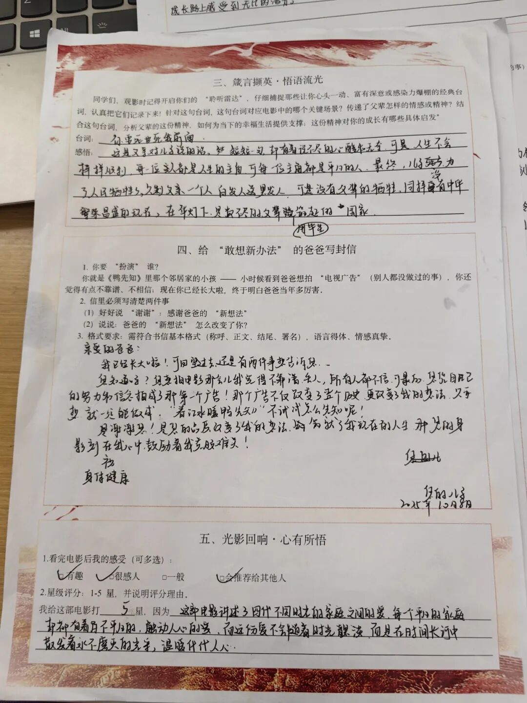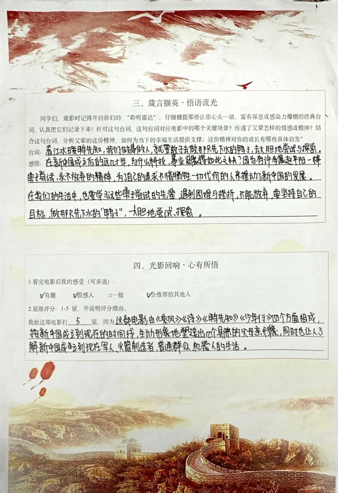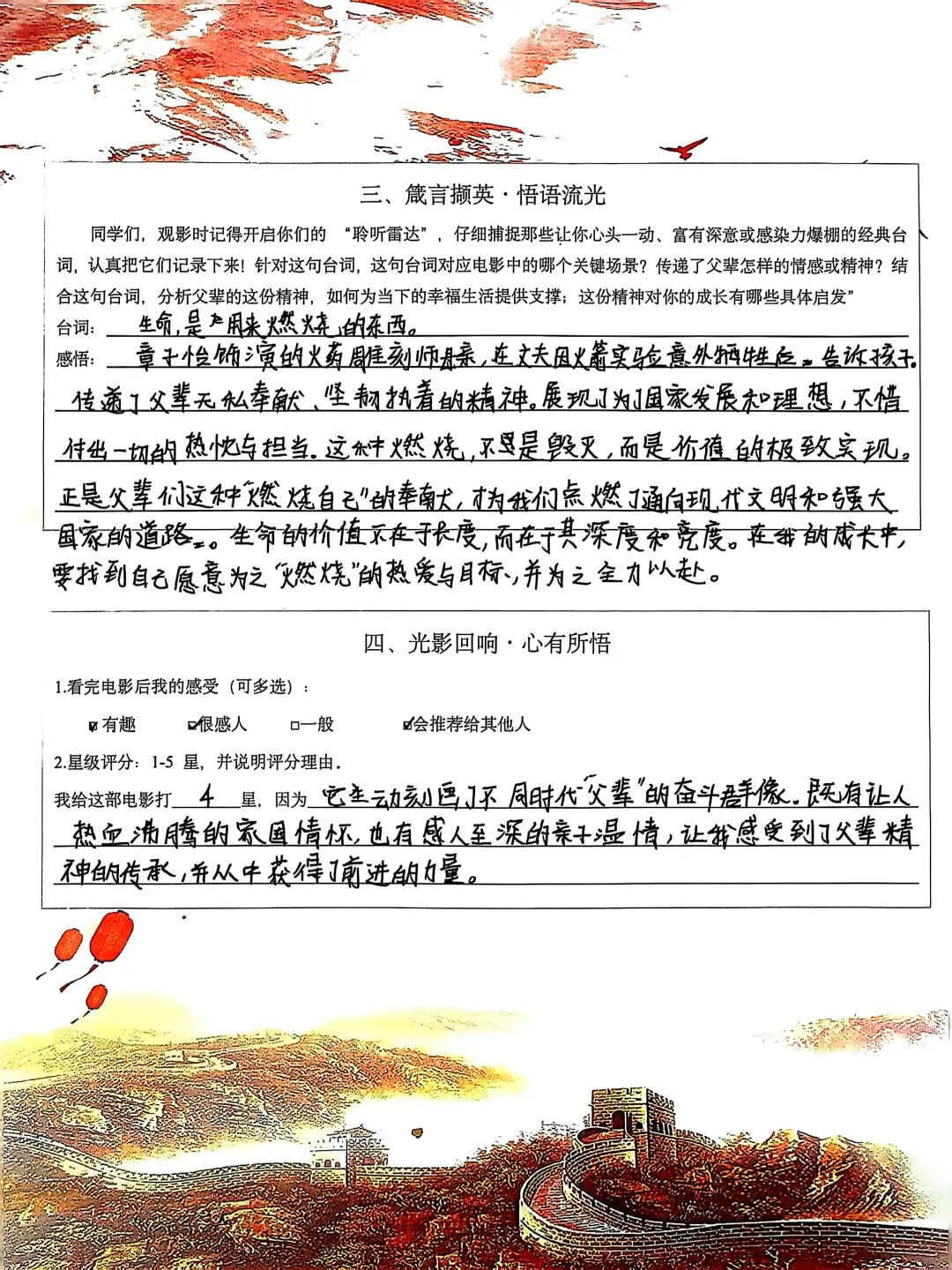 观影后,大家认真填写电影单,记录下触动自己的经典台词与瞬间。字里行间,是对父辈精神的敬仰,更是对家国情怀的深刻理解。