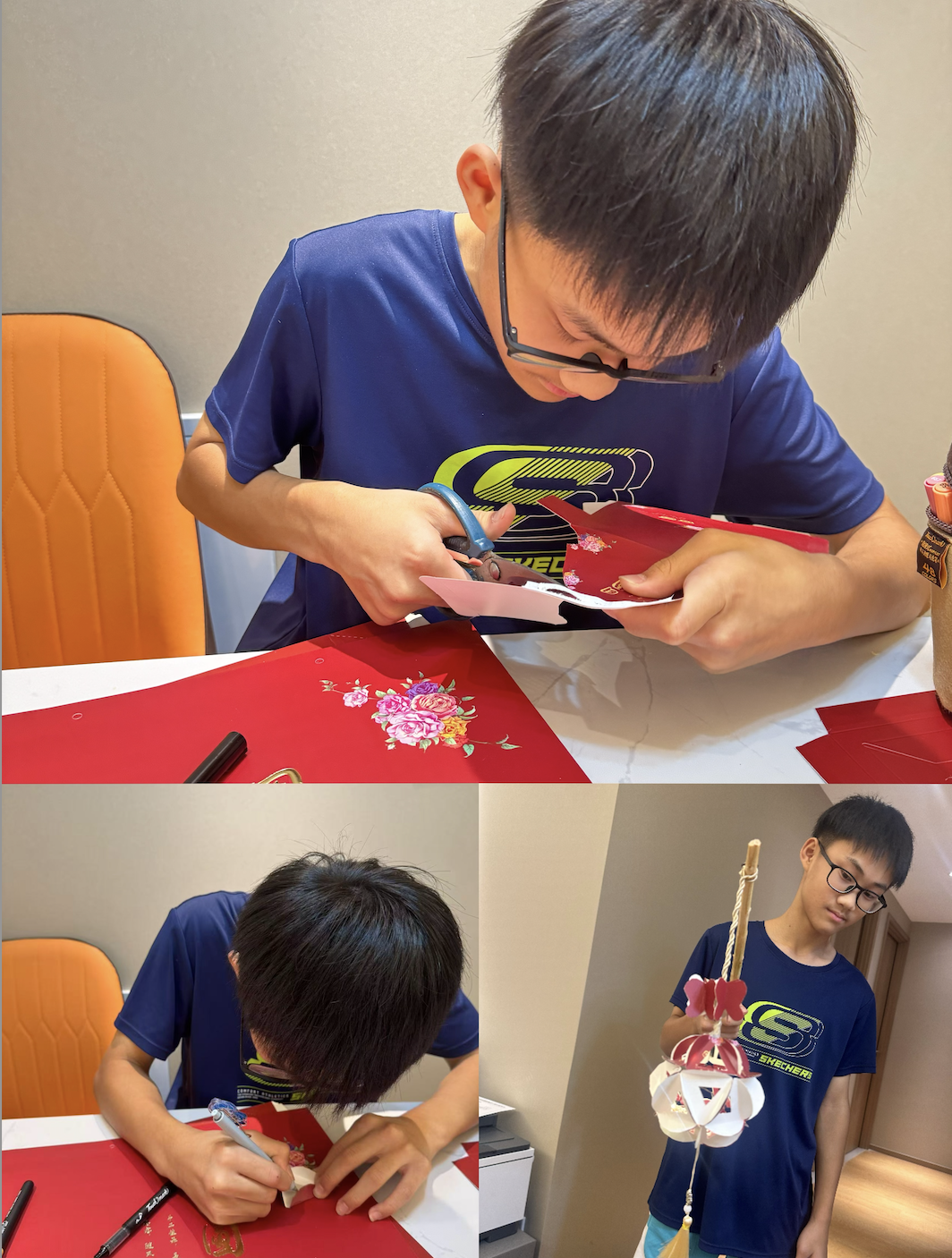 八年级的感恩行动,以 “环保 + 感恩” 为理念,在国庆、中秋双节期间写下温暖注脚。同学们收集家中废弃的月饼包装盒,发挥创意与动手能力,将原本闲置的纸盒变成了一个个精致的灯笼。同学在灯笼外侧贴上手写的感谢标语,让每一盏灯笼都充满心意。