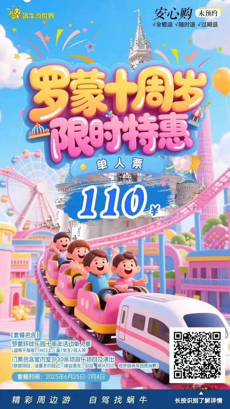 拾光同游,十载欢愉!¥110元购罗蒙环球乐园十周年活动单人票,即买即用,快乐无需等待,解锁你的暑期第一站:罗蒙环球乐园!