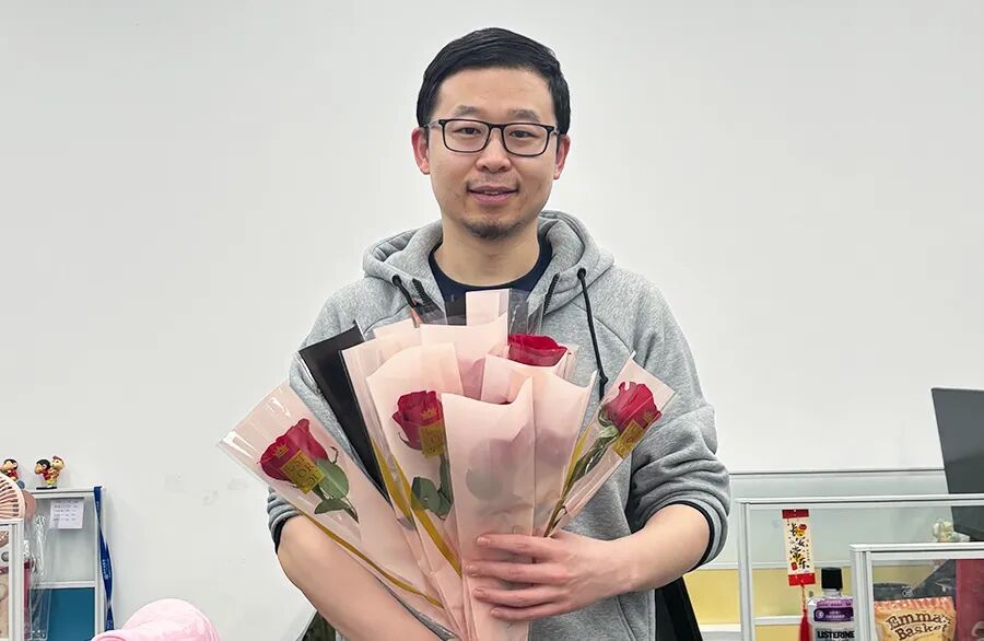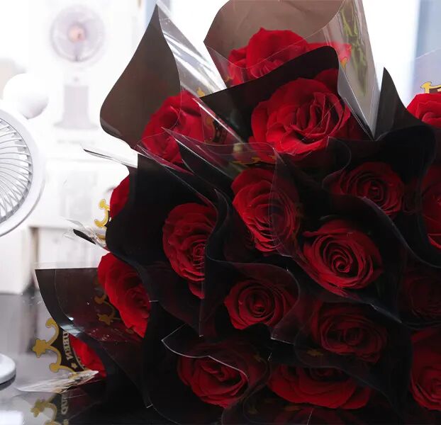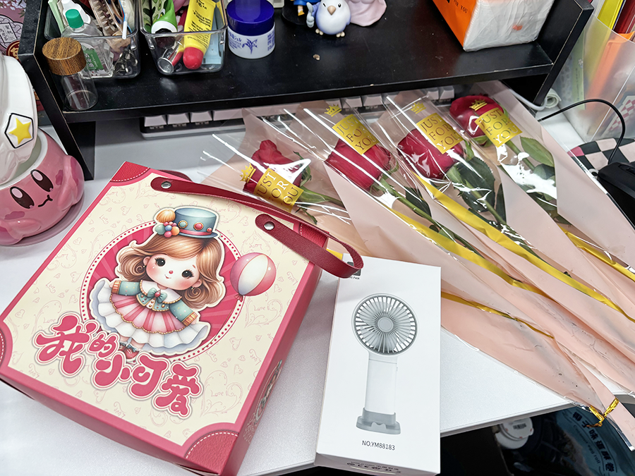 “玫瑰配风扇,今天就连空气都带着浪漫的味道。感谢公司的用心,让每一个平凡的日子都变得特别。”