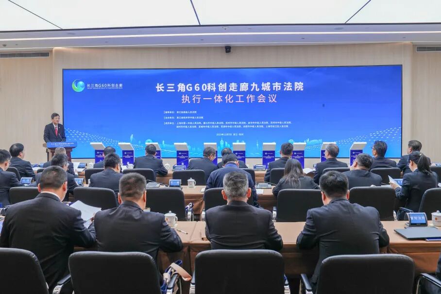 11月7日,长三角G60科创走廊九城市法院执行一体化工作会议在杭州中院召开。本次会议由浙江高院指导,杭州中院主办。浙江高院党组成员、副院长、执行局局长危辉星,杭州中院党组书记、院长唐学兵出席并讲话。上海一中院、嘉兴中院、杭州中院、金华中院、苏州中院、湖州中院、宣城中院、芜湖中院、合肥中院、上海松江法院院领导及执行局负责人、相关高校及行业协会专家学者参加会议。