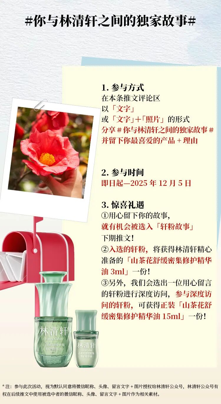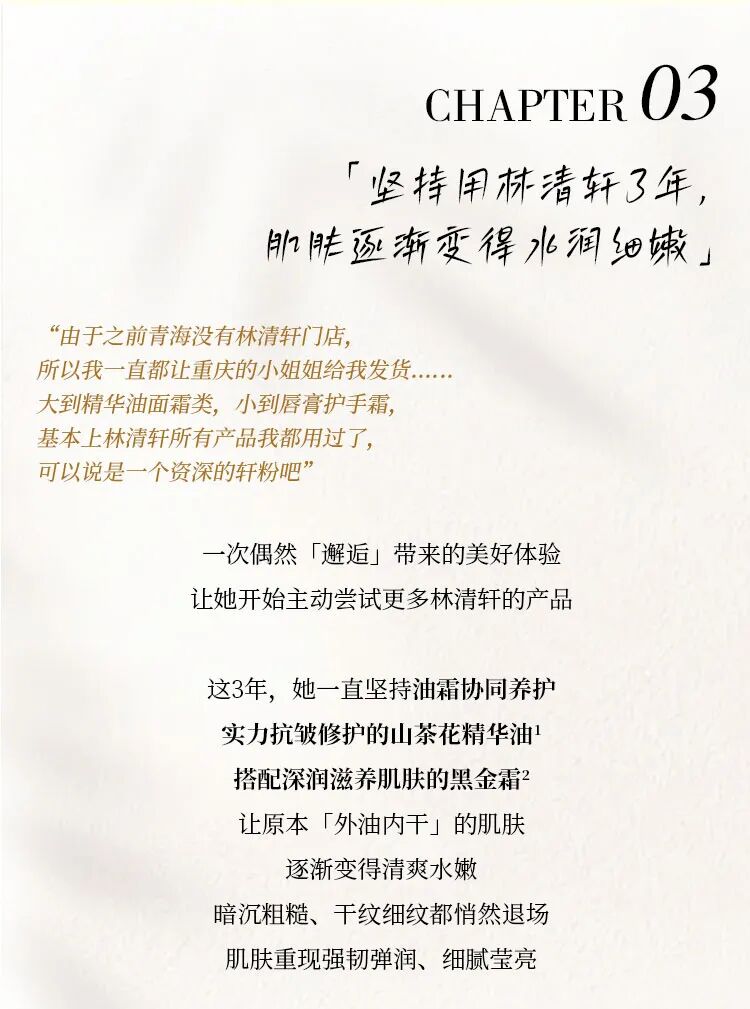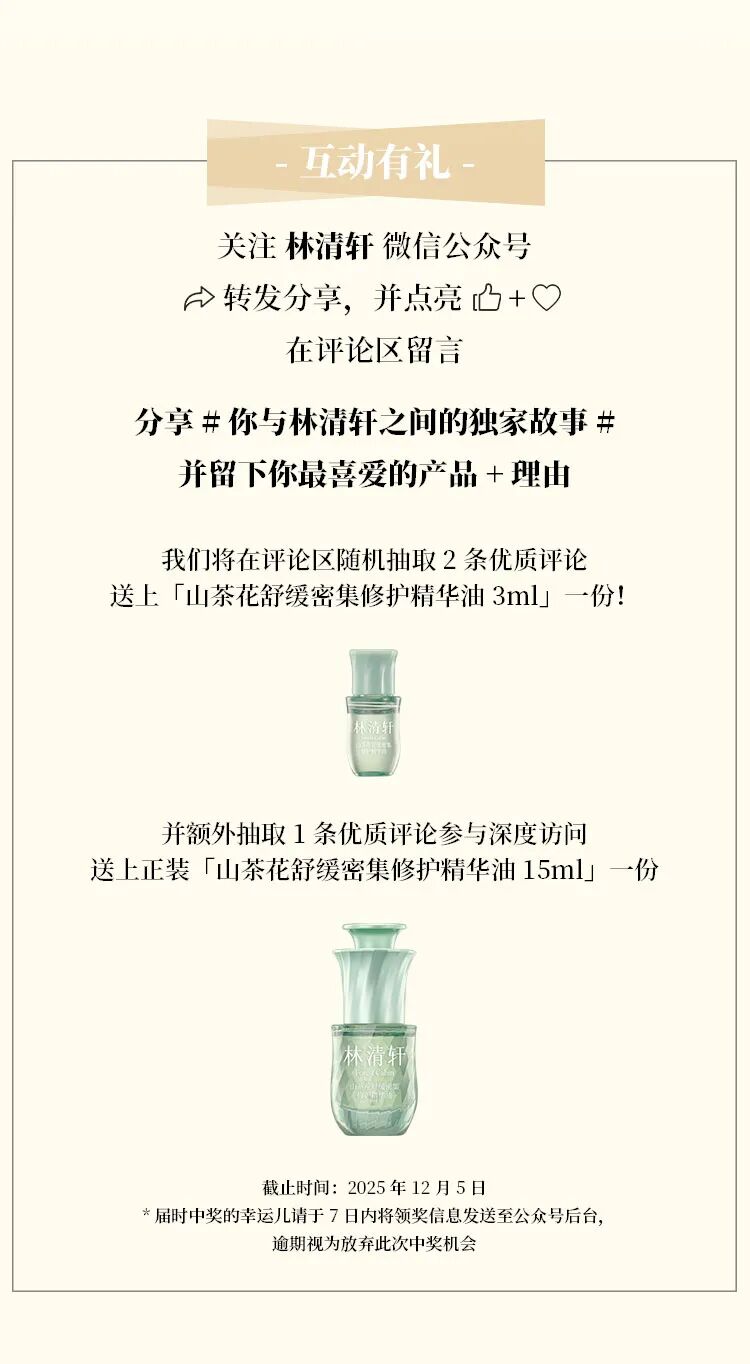 摘要:林清轩用户故事第四期,一次偶然「邂逅」带来的美好体验,让她与「外油内干」困扰说再见。【留下你与林清轩的专属故事,免费得——山茶花舒缓密集修护精华油 !】