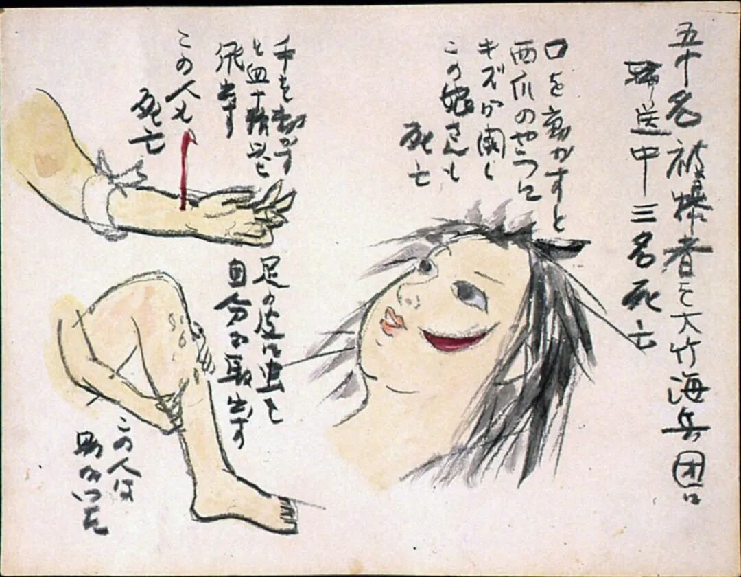 過了一會兒有人來了,我沒法靠近了。那時我想「說不定還有些體溫」,至今還忘不掉。心裏的事沒有說出口,只是「想告訴他們部隊裏的友人和雙親」。我一直在祈禱有一天能夠傳達到,相當痛苦。因為是關於美國人的事,我以為是不能畫出來的,但我想到「如果這幅畫某天被美國人看到了,那份心意也許能被理解吧」,就畫了下來。
