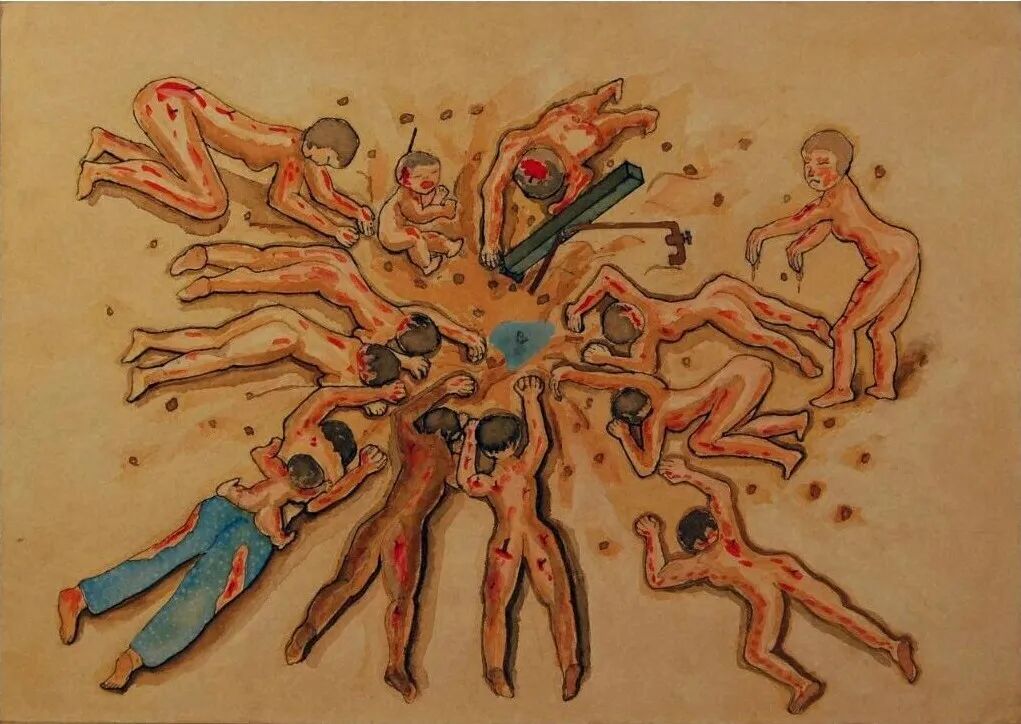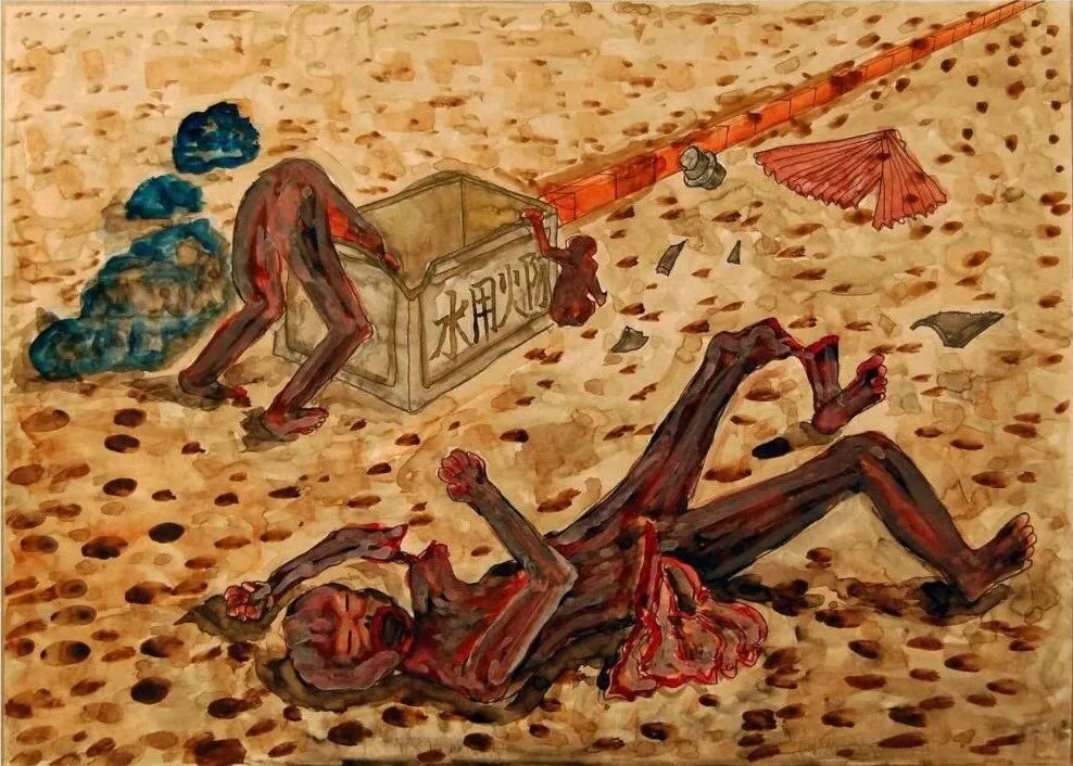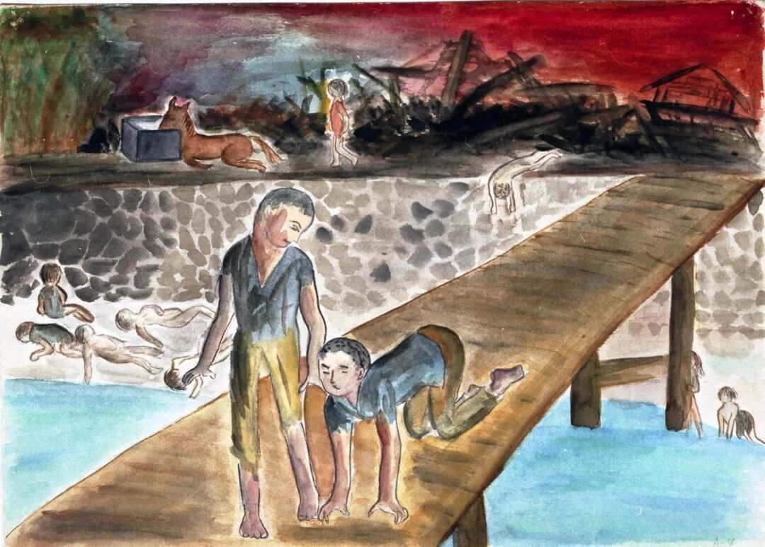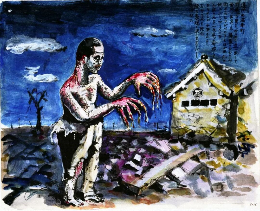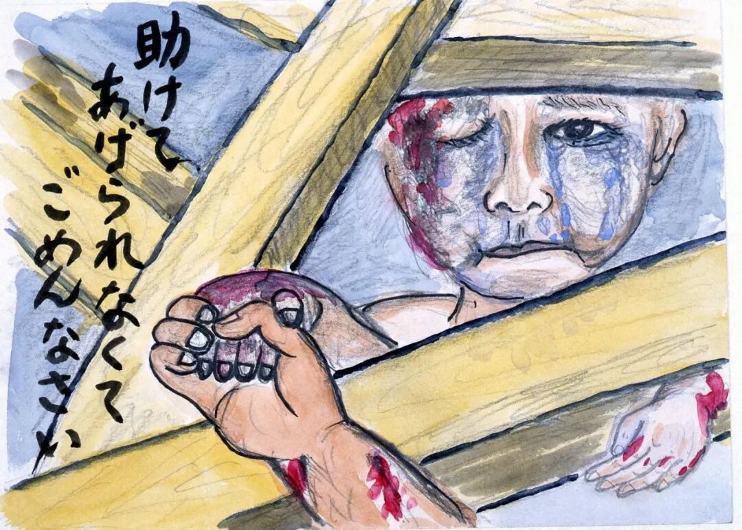 從倒塌的房屋中,好不容易爬出來,最先遇到了鄰居大叔。他的雙手的皮膚整片剝落,只在指甲處還掛著。他拼命地去尋找孩子,但是孩子和他都死去了。畫中的表現絕對沒有誇大。