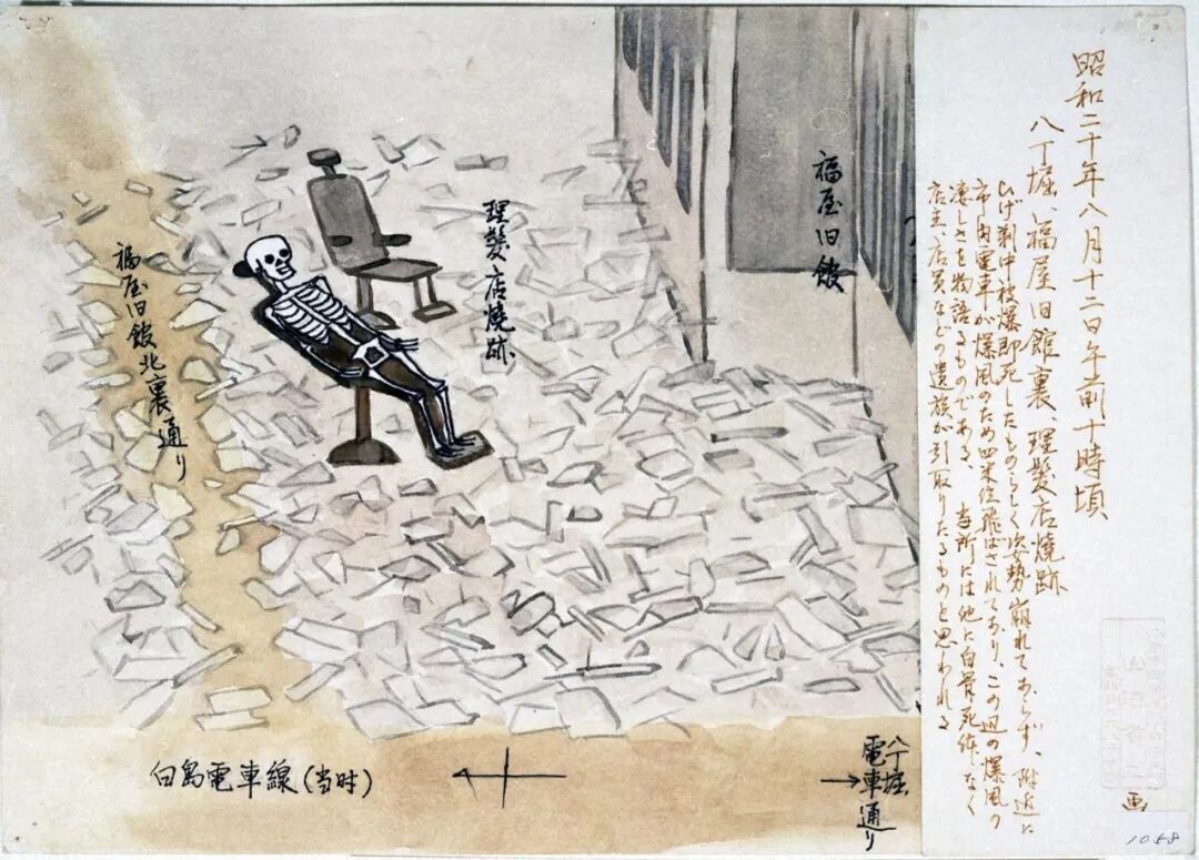 中午前,從爆炸中心地帶附近往東到京橋川,從事修復作業的我們在東練兵場附近吃午飯。休息了一會,我們穿過榮橋去繼續作業。突然我們看到兩具人骨橫躺在橋床上。在河的正中,沒有火燒痕跡,為什麼會被燒成骨頭呢?我很疑惑。稍微走在前面的人只是碰了一下骨頭,那之間,最多大概兩三秒,骸骨從腳尖到天靈蓋全部像多米諾骨牌一樣倒下了,乃至兩具都一起完全化成了灰。我畫這幅畫是想大家知道,下落不明的人中有些就像這樣消失了。