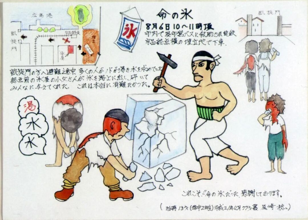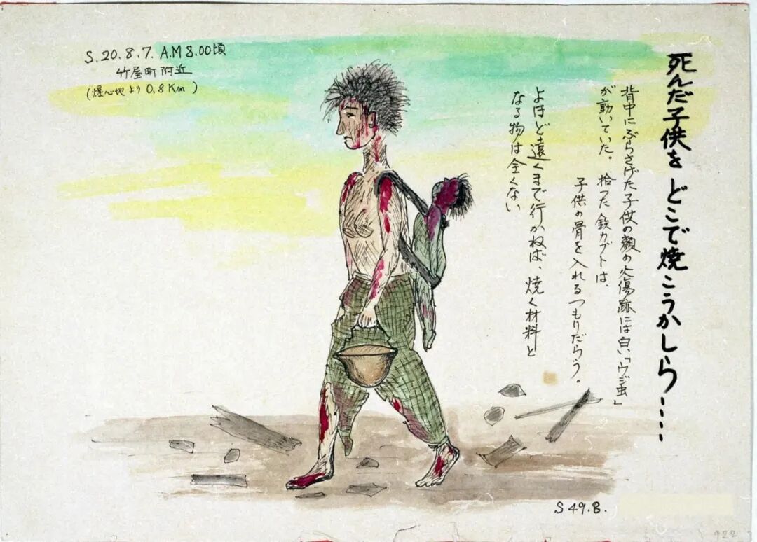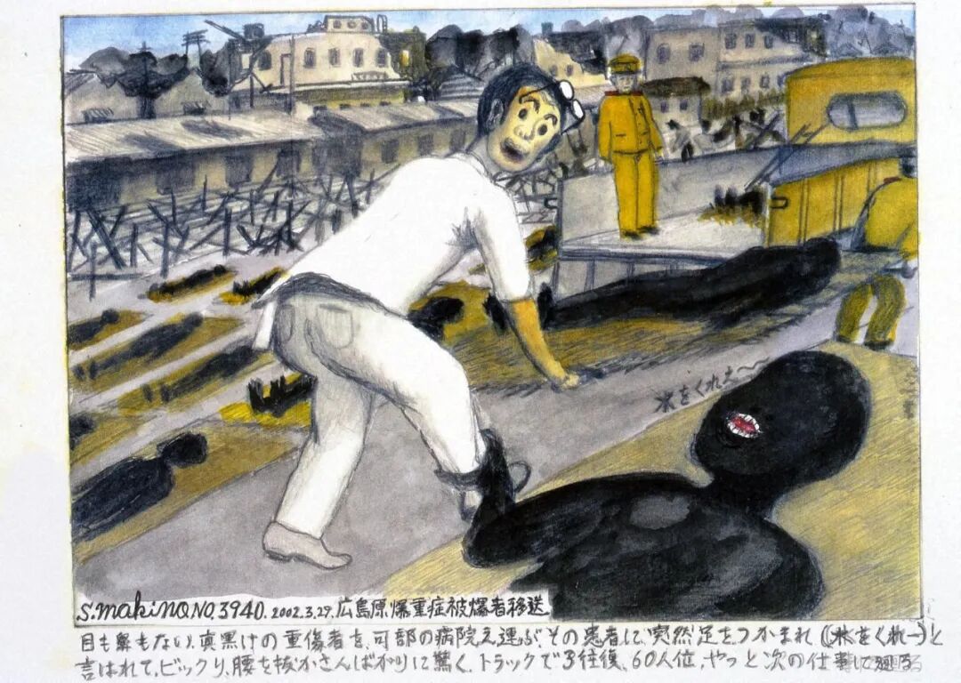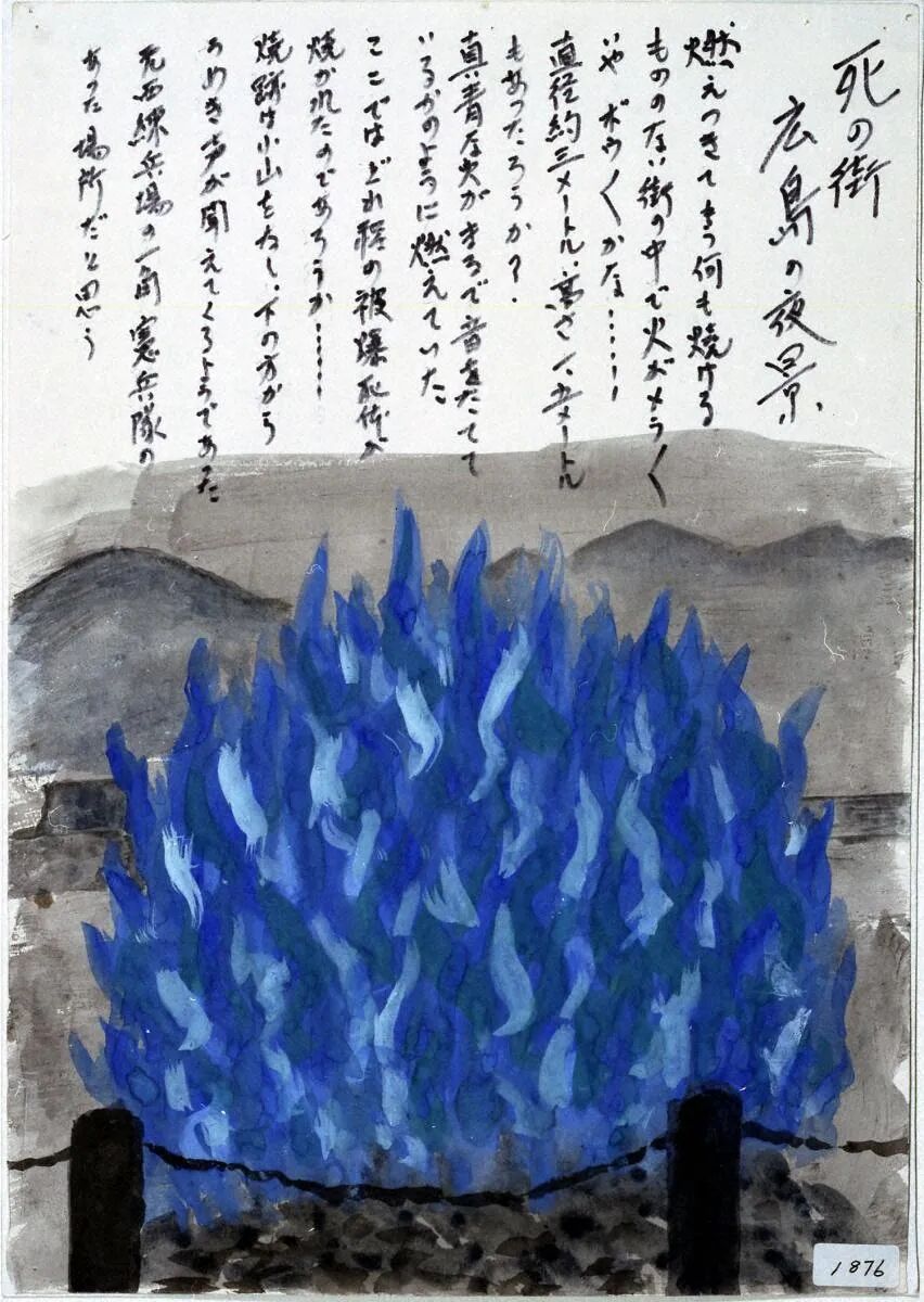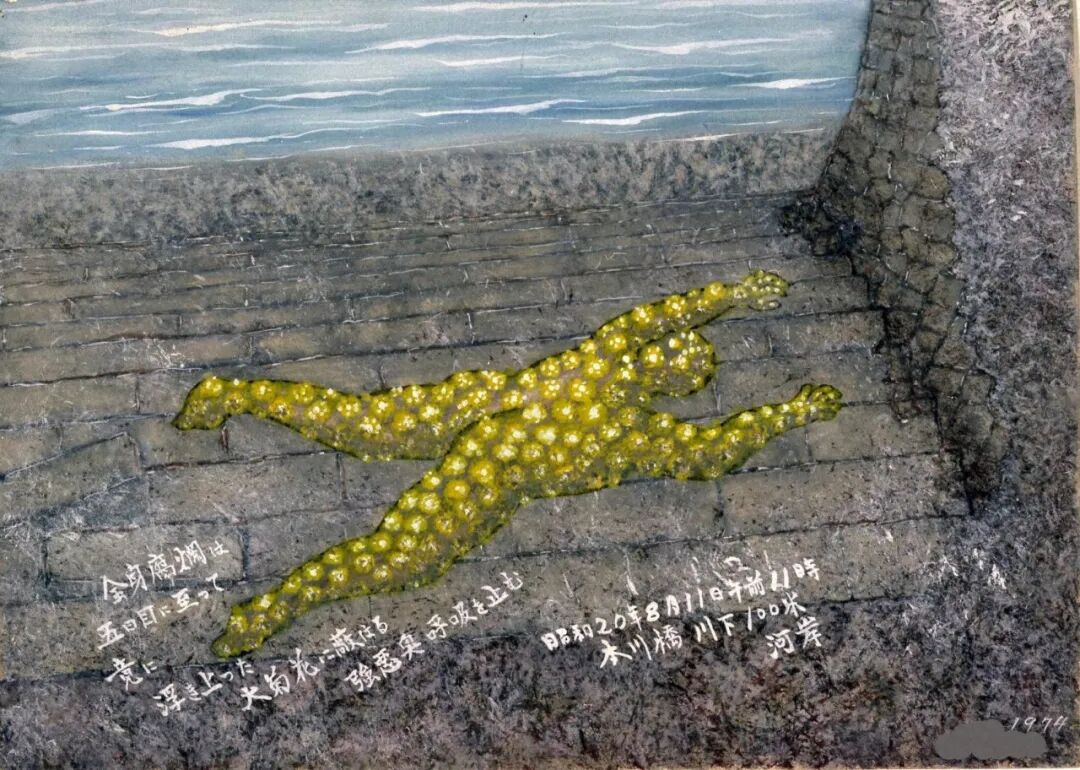 不知道她是在何處被爆的,她應該無法在熱天之下、燒灼的道路上(橋)移動了吧。她苦苦求水、求我把她扔到河裏去,但我什麼也做不了。核爆帶來的燒灼、把城市燒盡的猛火、盛夏的酷熱⋯⋯逼人求水,跳到市内流淌的的七條河流和眾多防火用水槽裏,死在其中的人有很多。