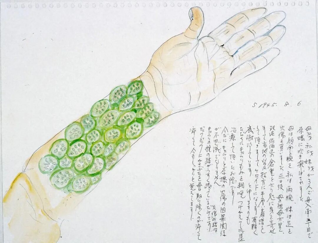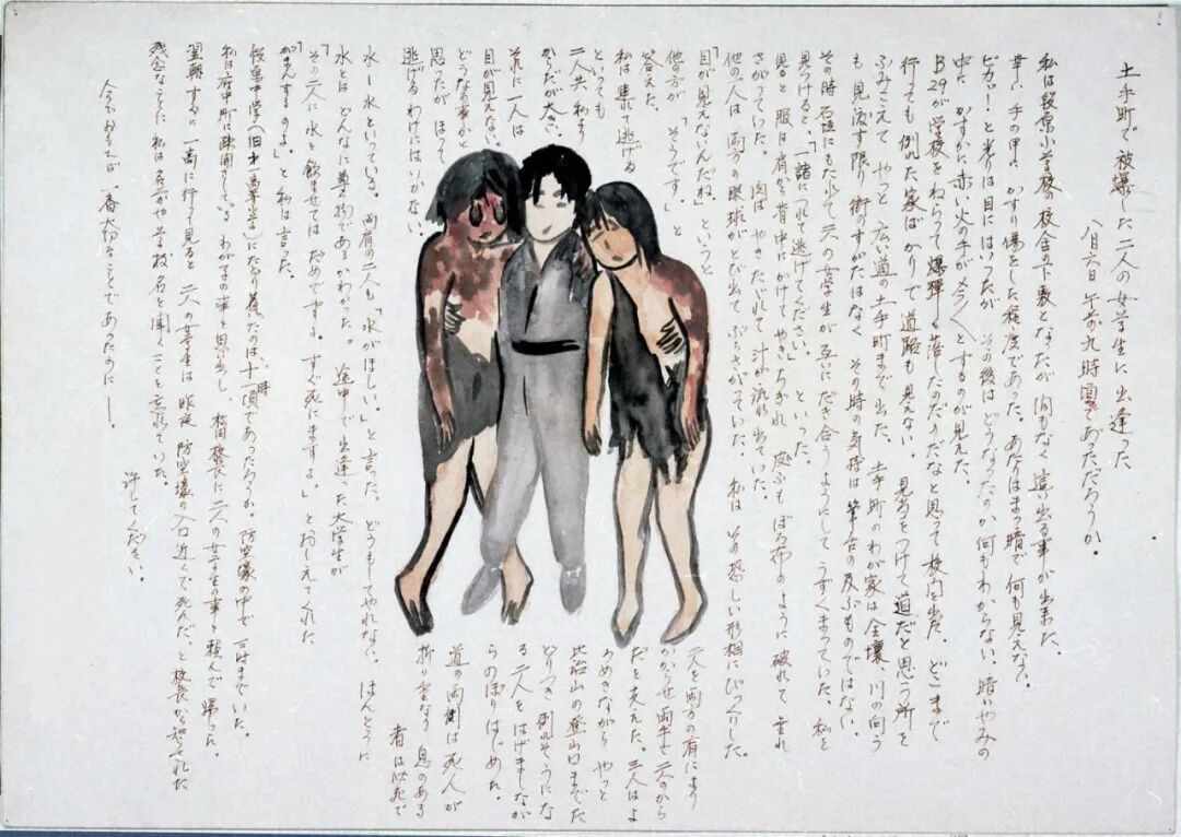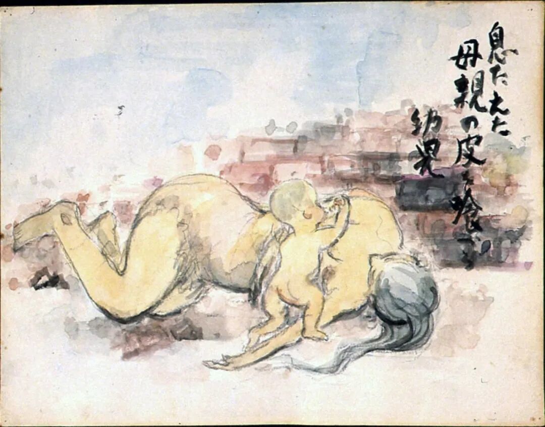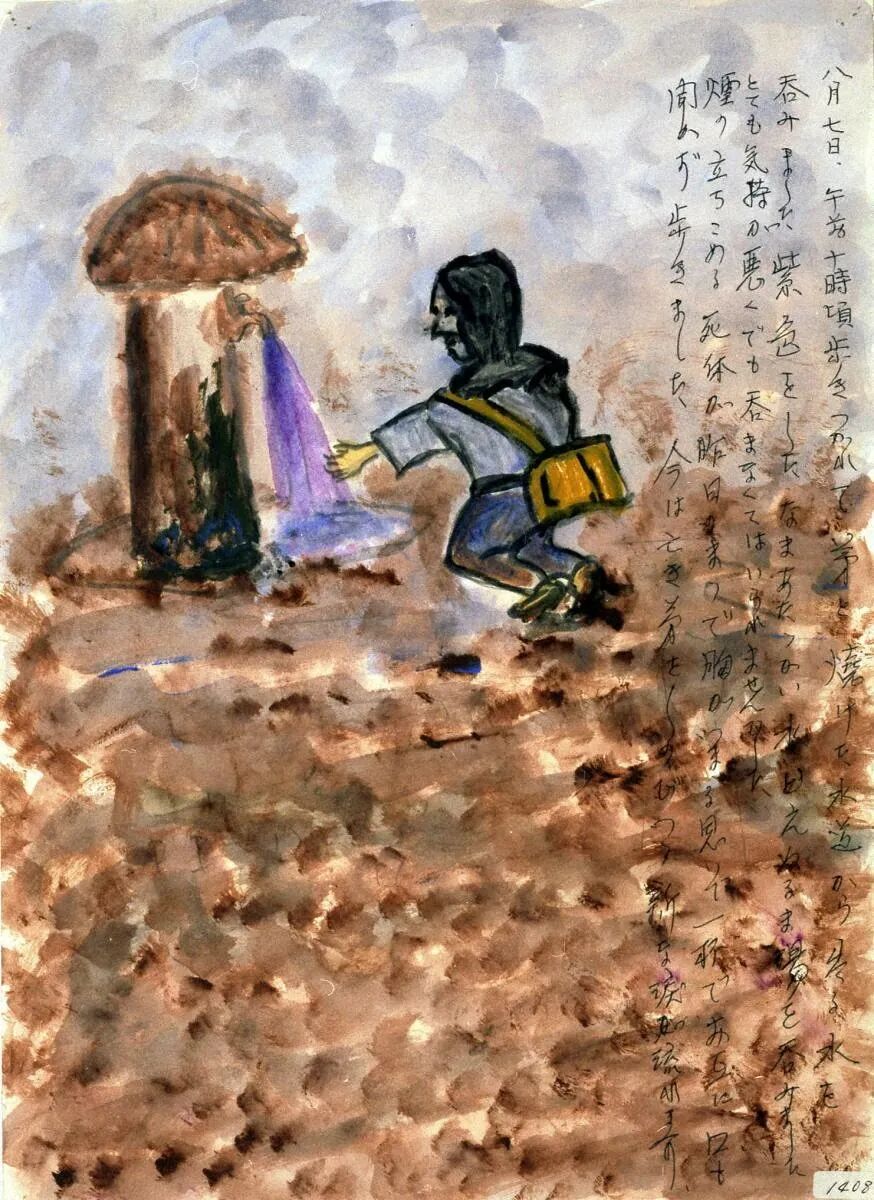 不知道她是在何處被爆的,她應該無法在熱天之下、燒灼的道路上(橋)移動了吧。她苦苦求水、求我把她扔到河裏去,但我什麼也做不了。核爆帶來的燒灼、把城市燒盡的猛火、盛夏的酷熱⋯⋯逼人求水,跳到市内流淌的的七條河流和眾多防火用水槽裏,死在其中的人有很多。