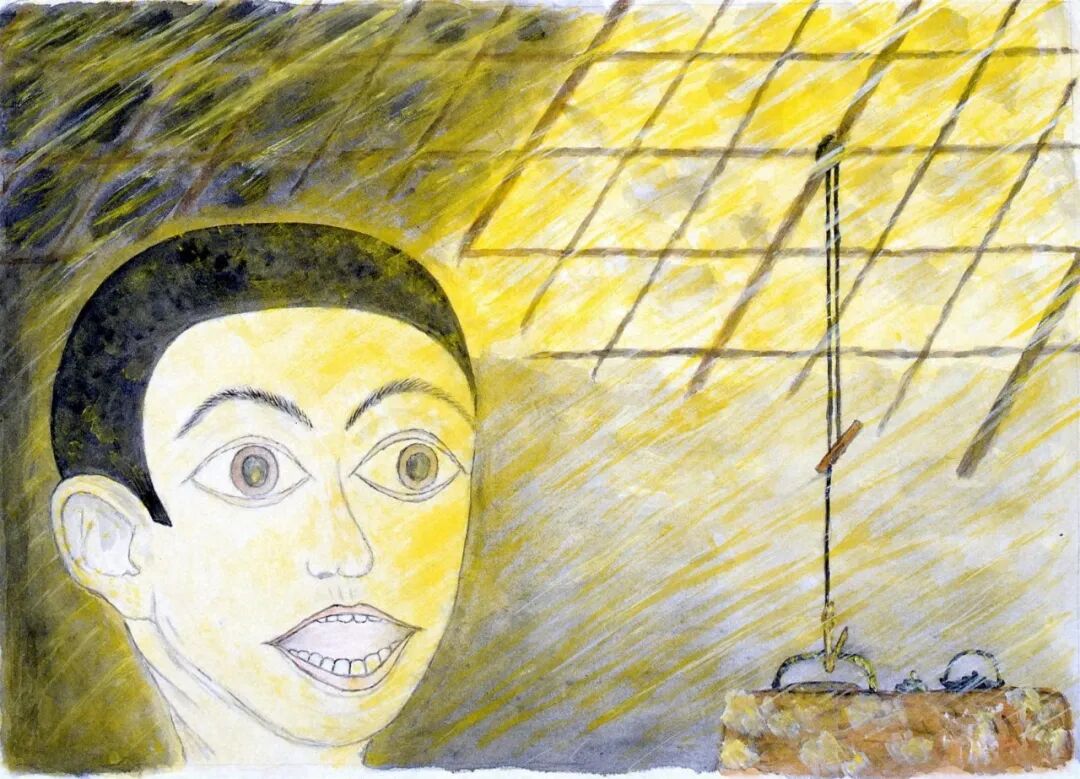 描繪原子彈(ピカドン【註:原子彈的日本俗稱,「ピカ」指閃光,「ドン」指爆炸聲】)投下的圖,表現的是藁葺屋頂的屋內、因圍爐裏的煙而昏暗的地方在一瞬間光束的光下通亮,一人驚駭的表情。這表情來自我本人,甲田敏春。