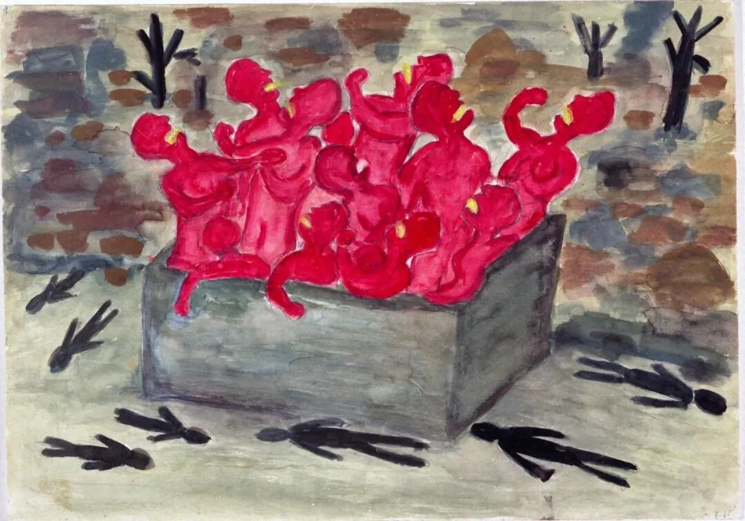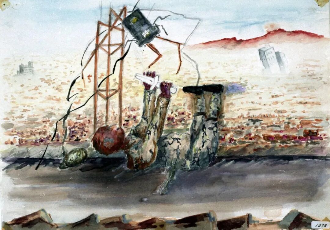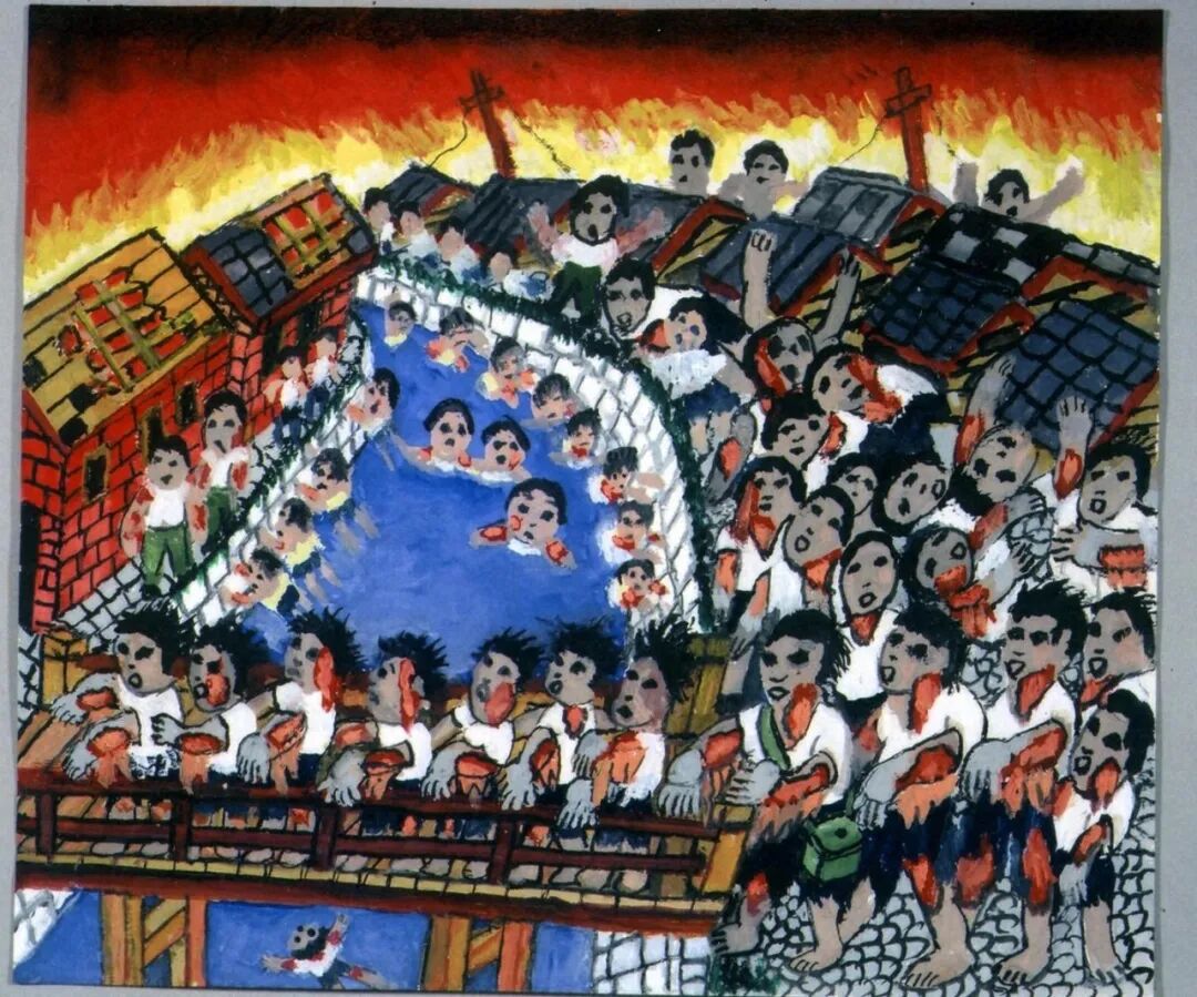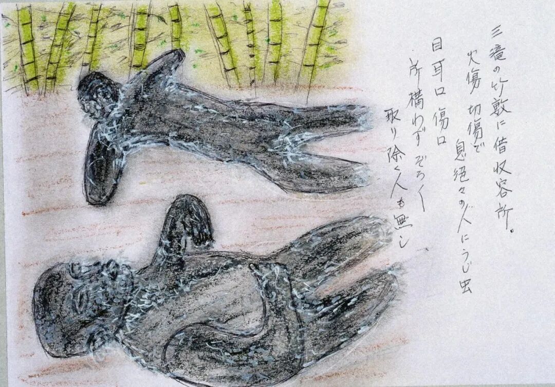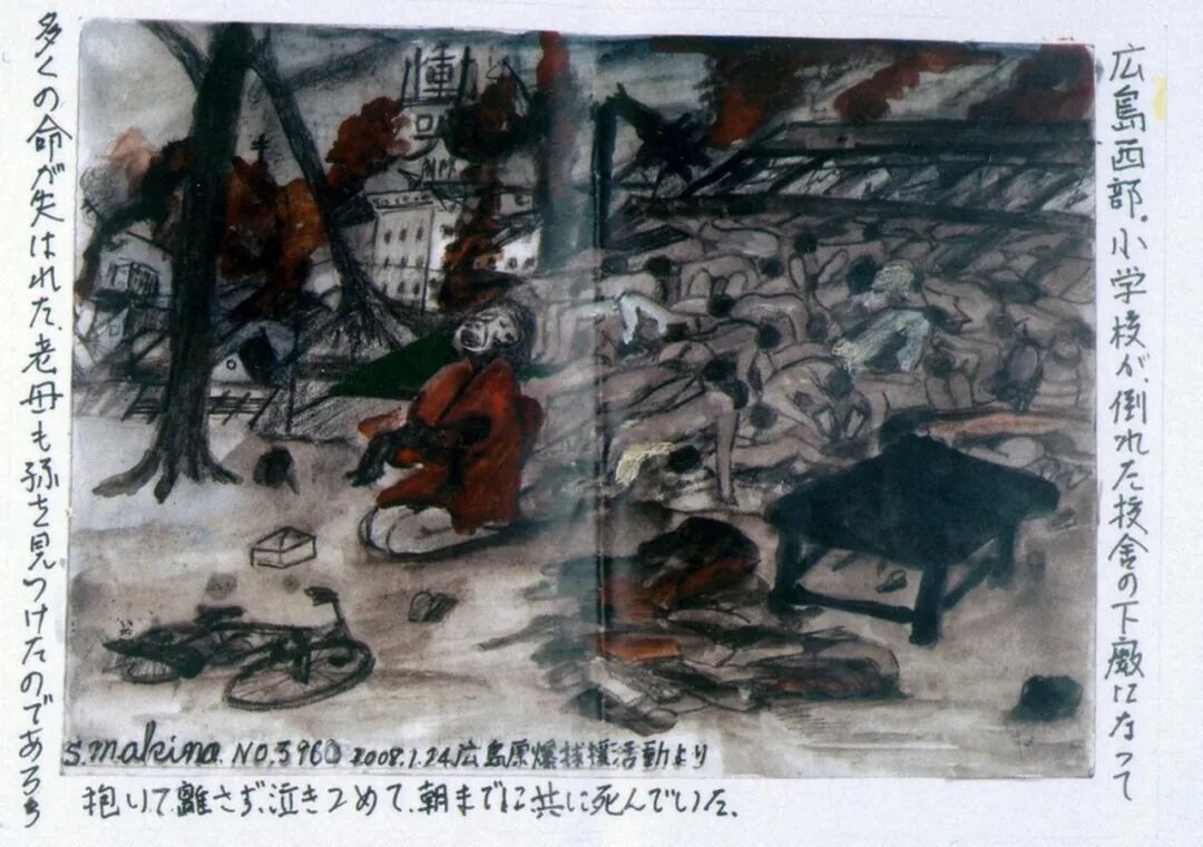 火每天在廣島的街上燃燒,持續了一星期以上。幾百個中學生為了進行清退、疏散的社會勞動排成一列,就那樣幾百個人並排著死掉了。我看到那場景眼淚止不住地流。一邊哭,一邊說著對不起、對不起,跨著屍體走了過去。似乎都是比較完整的屍體。一星期左右屍體腐爛了,炎熱的夏日裏,被隨意棄置的死去的人們,那肉裏的血和脂肪的極強烈的屍臭,讓人難以呼吸。蛆蟲孳生,從傷口裏鑽出來。接著它們變成幾百隻蒼蠅,黒壓壓的,看著也令人難過。幾十人的屍體被一直一直放著。人們只是倉皇逃跑,沒有一個人處理屍體。漸漸肚子餓了,還是要去找些能吃的。一無所獲時有士兵給了我三個飯糰。那時我說了一句「對不起」。飯糰我沒有馬上吃,而是帶著,不知道能保存幾天。我非常擔心家人,到處尋找,從別人口中我才知道他們果然是四散逃走了。接著下起了雨,黒色的雨,淋濕全身,像被塗上黒色的墨,髒透了。我撿來被燒過的鐵皮,蹲在裏面忍耐著。雨時落時停。【註:黒雨是廣島核爆往事的象徵之一,是「放射性降下物」,由核爆後的雜質、放射物等構成,油膩、黏稠】